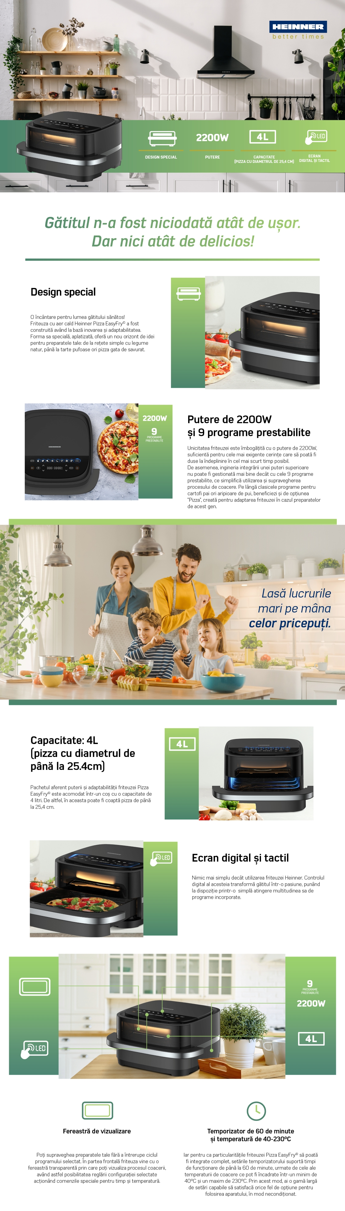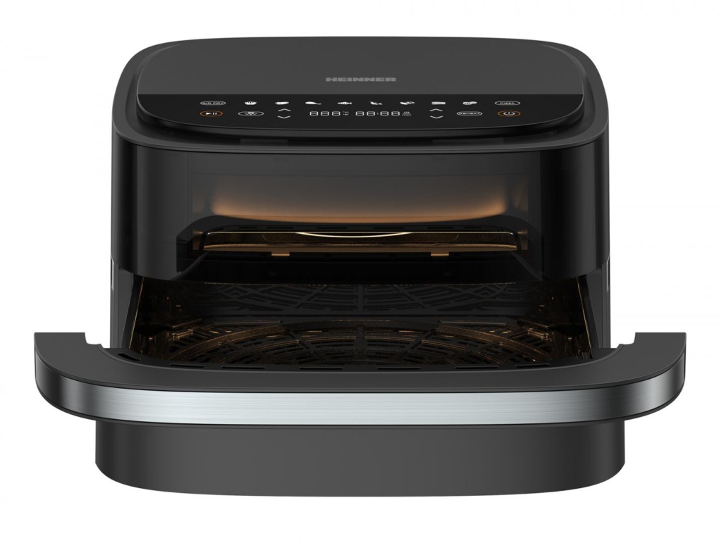2 IN 1 AIR FRYER AND PIZZA MAKER HEINNER Pizza EasyFry HPAF-B4DC22BK, 2200W (1500W+600W), CAPACITY 4L, PIZZA DIAMETER 25.4 CM, DIGITAL CONTROL, MOTOR DC, 9 PRESET PROGRAMS, ADJUSTABLE PROGRAMS, TIMER: 60 MINUTES, TEMP.: 40-230?, AUTO-OFF FUNCTION, SEE-THROUGH WINDOW, NON-STICK COATING, BLACK