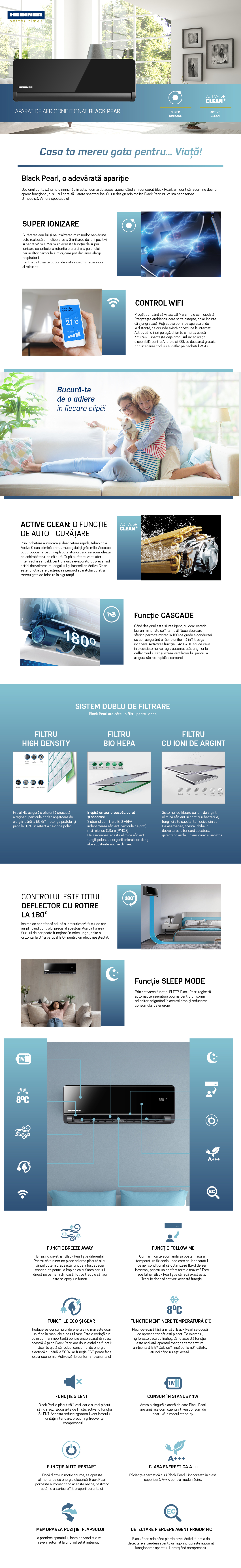 Aparat de aer conditionat HEINNER BLACKPEARL, 12000BTU, WiFi, clasa eenrgetica racire A+++/incalzire A++, Super ionizare, fucntie "Active clean", functie"Breeze away", functie "Cascade", functie ECO, functie mentine temperatura la 8⁰C, functie "Follow me", filtru cu densitate ridicata, filtru silver-ion, filtru HEPA BIO, carcasa: negru/panel negru oglinda
