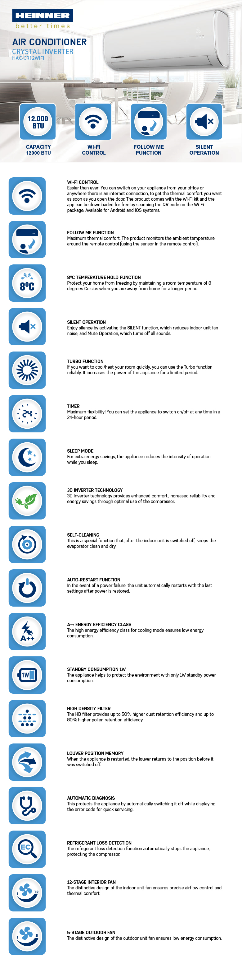 Air conditioner Crystal Heinner HAC-CR12WIFI, capacity: 12000BTU, heating energy class: A+, cooling energy class: A++, WIFI control, Auto-restart function, Sleep mode, Follow me function, Self clean, Silence function, 8°C heating function, refrigerant leakage detect function, white