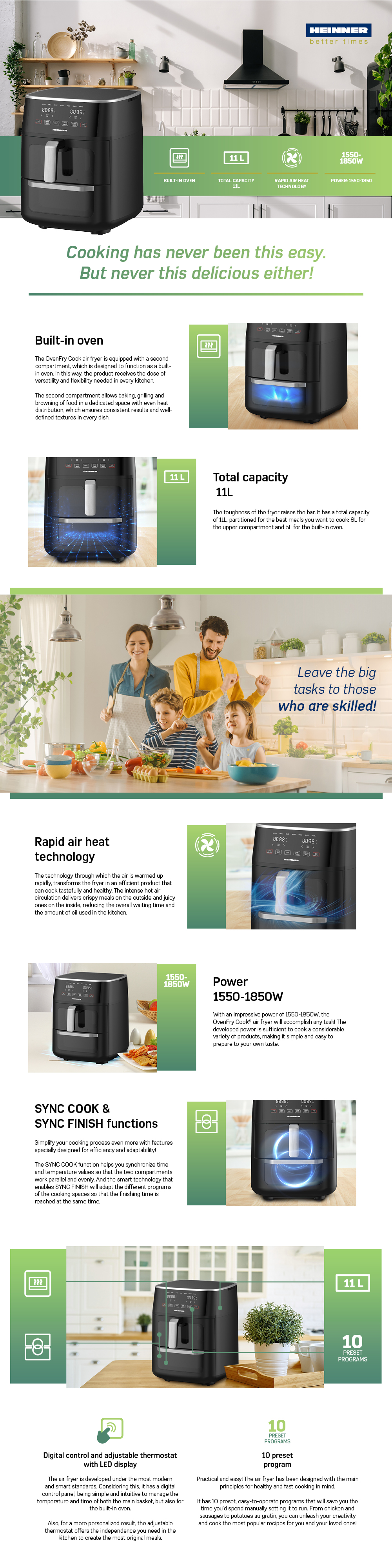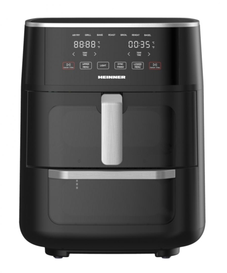 AIR FRYER DUAL ZONE HEINNER OVENFRY COOK HAFO-M11BK1700, POWER: 1500-1850W, TWO COMPARTMENTS (AIR FRYER AND OVEN), TOTAL CAPACITY: 11L (6 + 5L), DIGITAL DISPLAY WITH TOUCH CONTROL, TIMER 90 MIN, TEMPERATURE 40-230 GRADE, 10 PRESET PROGRAMS, FUNCTIONS: SYNC FINISH, SYNC COOK, SEE-THROUGH WINDOW, INTERNAL LIGHT, AUTO-OFF, BLACK