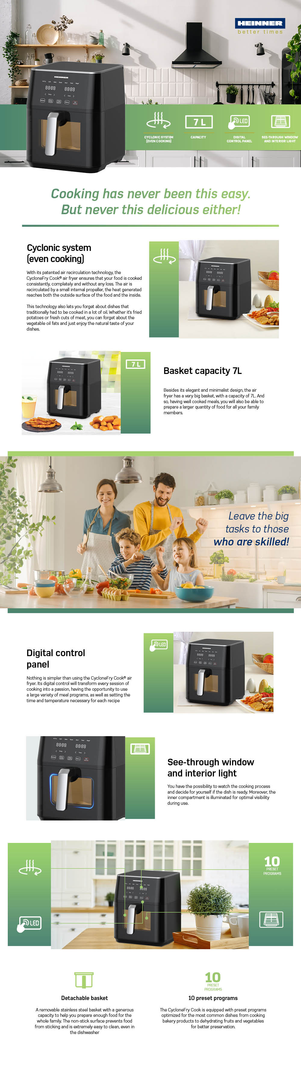 AIR FRYER HEINNER CYCLONEFRY COOK HAF-M7BK1800, 1500-1800W, CAPACITY: 7L, CYCLONE AIR TECHNOLOGY (EVEN COOKING), DIGITAL DISPLAY WITH TOUCH CONTROL, TIMER 60 MIN, TEMPERATURE 40-200 GRADES, 10 PRESET PROGRAMS, DETACHABLE NON-STICK BASKET, SEE-THROUGH WINDOW AND INTERNAL LIGHT, METAL CAVITY, MEMORY FUNCTION, AUTO-OFF, COLOR: BLACK
