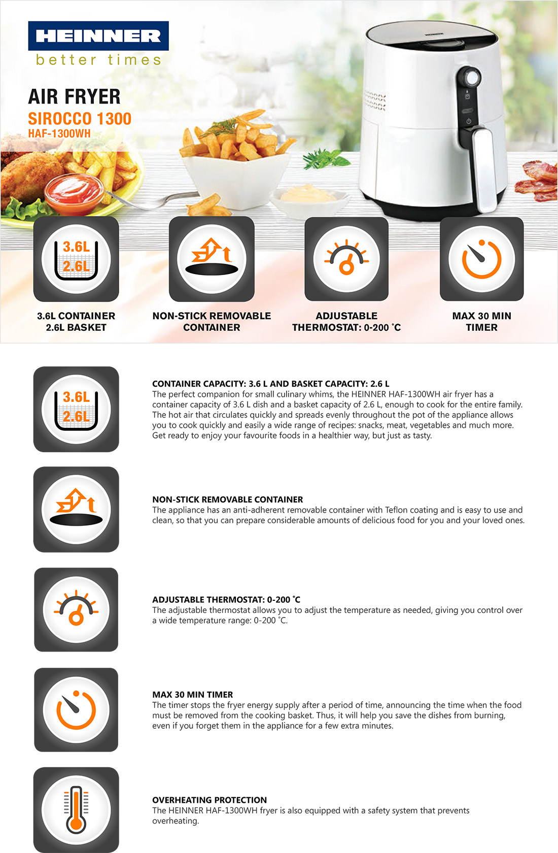 Hot air fryer Heinner Sirocco 1300 HAF-1300WH, 1300W, non-stick detachable basket capacity: 2.6l, outer pot with non-stick coating, adjuatble thermostat: 0-200°c, timer: max 60 min, cool touch, overheating protection, white