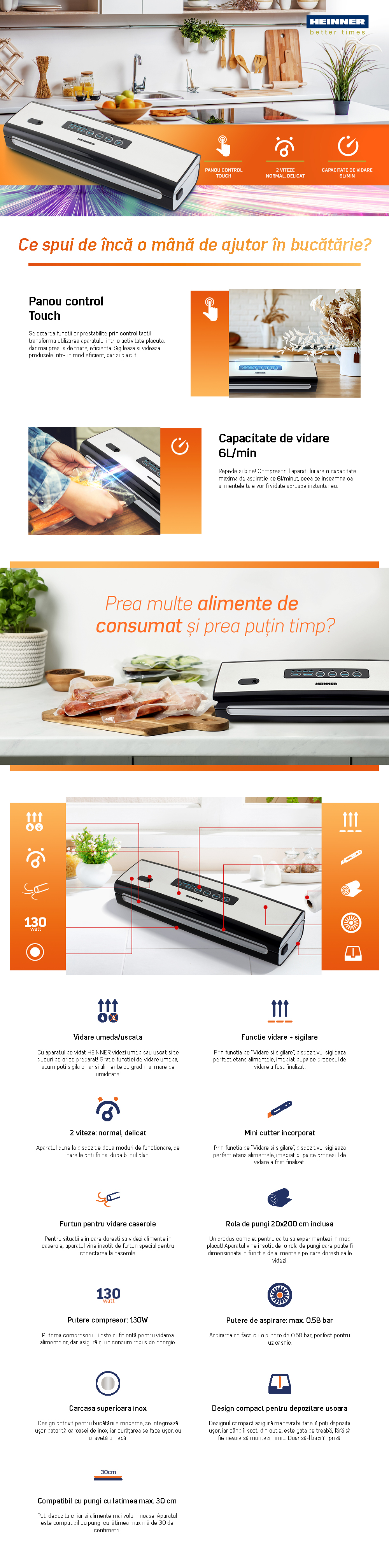 Aparat de vidat si sigilat Heinner HAV-130BKSS, vidare si sigilare , vidare uscata si umeda, functie sigilare , vidare caserole , control Touch, functie Pulse , doua moduri: normal/delicat , rola pungi inclusa 20x200 cm , furtun vidare caserole , mini cutter incorporat, compatibil cu pungi latime 30 cm , capacitate vidare: 6L/min, presiune: 0.58bar , putere: 130W , design compact pentru depozitare usoara, carcasa superioara inox