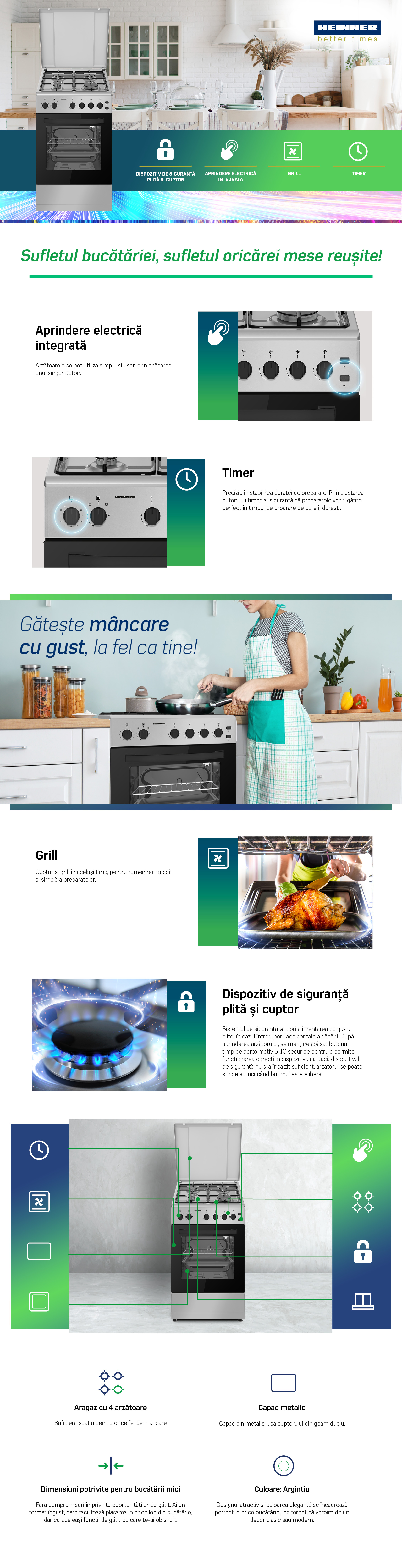 ARAGAZ GAZ HEINNER HFSC-S60LITGSL, 50X60CM, 4 ARZATOARE, SUPORT EMAIL, CAPAC METALIC, APRINDERE ELECTRICA PLITA SI CUPTOR, DISPOZITIV DE SIGURANTA PLITA SI CUPTOR, TIMER, GRILL, LUMINA CUPTOR, USA CUPTOR CU GEAM DUBLU DETASABIL, DUZE GPL INCLUSE, TAVA SI GRATAR CROMAT, DIMENSIUNI ( LXAXI): 50X60X85 CM, CULOARE: ARGINTIU