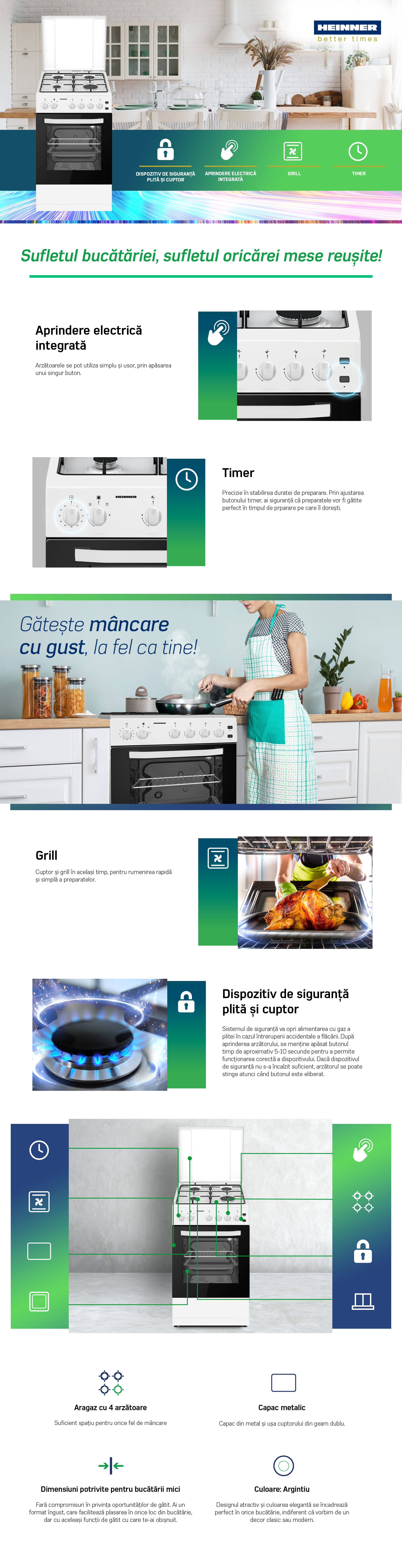 ARAGAZ GAZ HEINNER HFSC-S60LITGWH, 50X60CM, 4 ARZATOARE, SUPORT EMAIL, CAPAC METALIC, APRINDERE ELECTRICA PLITA SI CUPTOR, DISPOZITIV DE SIGURANTA PLITA SI CUPTOR, TIMER, GRILL, LUMINA CUPTOR, USA CUPTOR CU GEAM DUBLU DETASABIL, DUZE GPL INCLUSE, TAVA SI GRATAR CROMAT, DIMENSIUNI ( LXAXI): 50X60X85 CM, CULOARE: ALB