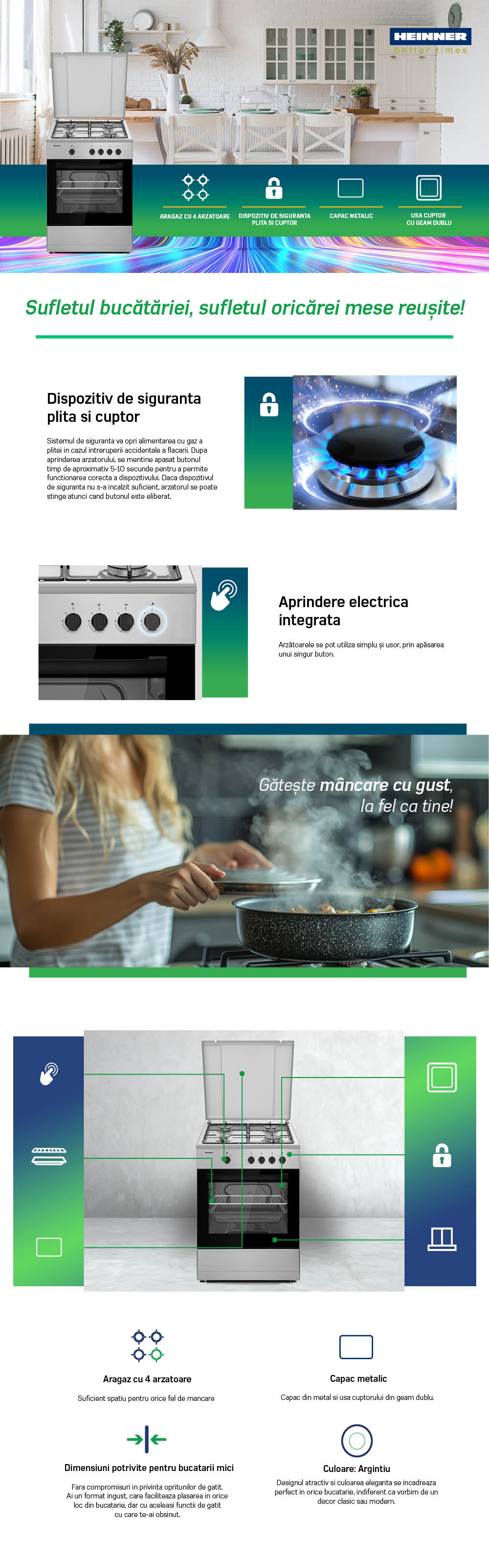 GAS COOKER HEINNER HFSC-SME66ISL, 60X60CM, 4 GAS BURNERS,ENAMEL SUPPORT, METALLIC LID, AUTO IGNITION FOR HOB, GAS SAFETY HOB AND OVEN, DOUBLE GLASS OVEN DOOR, SPARE LPG NOZZLES INCLUDED, OVEN TRAY AND GRID, DIMENSIONS ( WXDXH): 60X60X85 CM, COLOUR: SILVER