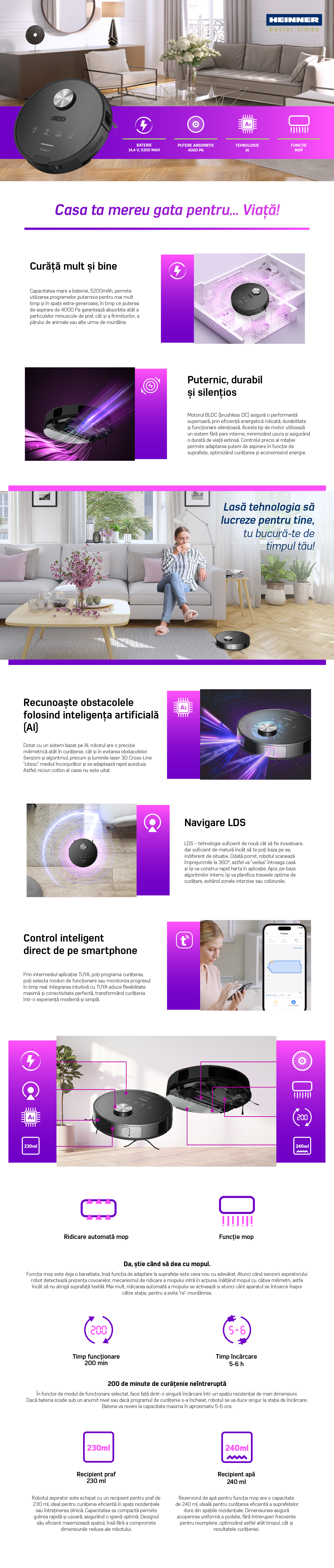 ASPIRATOR ROBOT HEINNER HI-RoboX+ HRVC-MAI52BK, ACUMULATOR 14.4V / 5200 mAh, PUTERE ABSORBTIE: 4000Pa, TUYA App, MOTOR BLDC, FUNCTIE MOP, NAVIGATIE LDS, AI-LINE LASER 3D DETECTION TECHNOLOGY, AUTONOMIE ACUMULATOR: 200 MIN, TIMP INCARCARE 5-6 H, CAPACITATE RECIPIENT PRAF:230 ml, CAPACITATE REZERVOR APA: 240 ml, FUNCTIE RIDICARE AUTOMATA MOP - DETECTARE COVOR, SENZOR ANTI-COLIZIUNE, SENZOR ANTI-CADERE, INALTARE 2 CM, ACCESORII INCLUSE: 2 x PERII LATERALE, 1 x LAVETA MOP, 1 x FILTRU HEPA, CULOARE: NEGRU