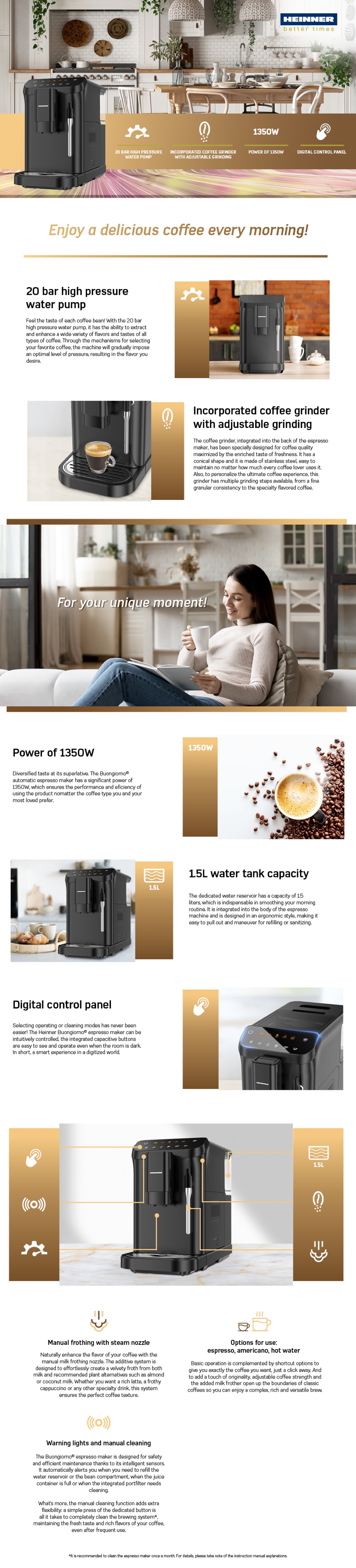 AUTOMATIC ESPRESSO MAKER HEINNER BUONGIORNO HEMA-D20DBK, POWER: 1350W, WATER PUMP: 20BAR, INCORPORATED COFFEE GRINDER, MANUAL FROTHING WITH STEAM WAND, DIGITAL PANEL WITH TOUCH CONTROL, WATER TANK CAPACITY: 1.5L, COFFEE BEAN TANK CAPACITY: 190G, ADJUSTABLE GRINDING, COFFEE NOZZLE WITH ADJUSTABLE HEIGHT, DETACHABLE EXTRACTOR, BEVERAGE OPTIONS: SMALL/LARGE ESPRESSO, AMERICANO, HOT WATER, MANUAL FROTHING, WARNING INDICATORS: BREWER CLEAN, LACK OF WATER/BEANS, RESIDUE FULL, FUNCTIONS: BEAN EMPTYING, MANUAL CLEAN, BLACK
