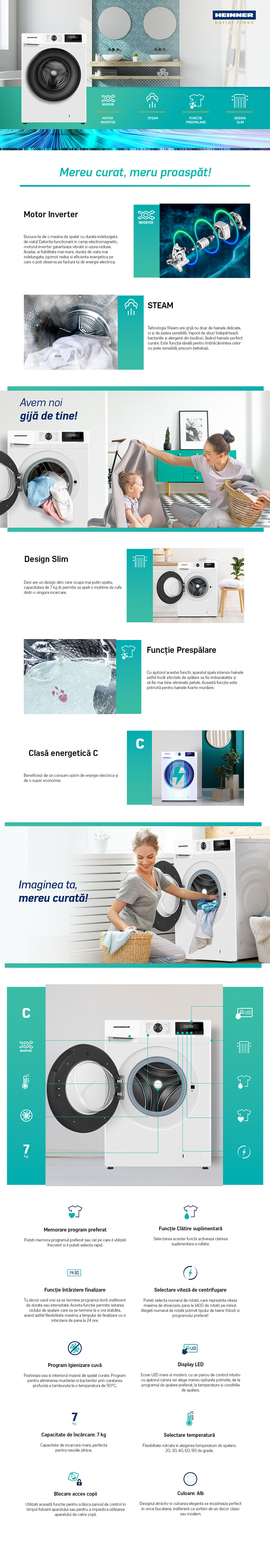 AUTOMATIC WASHING MACHINE HEINNER HWM-H7014IVSMC+++, LOADING CAPACITY 7KG, SPIN SPEED 1400RPM, ENERGY EFFICIENCY CLASS A, INVERTER MOTOR, 15 PROGRAMS, DIGITAL DISPLAY, QUICK PROGRAM 15 MIN, ALLERGY STEAM PROGRAM, BABY STEAM CARE PROGRAM, DELAY END, EXTRA-RINSE, PRE-WASH, INTENSIVE WASH, AUTOMATIC WEIGHTING, FAVOURITE PROGRAM, TEMPERATURE SELECTOR, SPIN SPEED SELECTOR CHILD LOCK, DIMENSIONS (WXDXH): 59.5X46.5X84.5 CM, COLOR: ALB