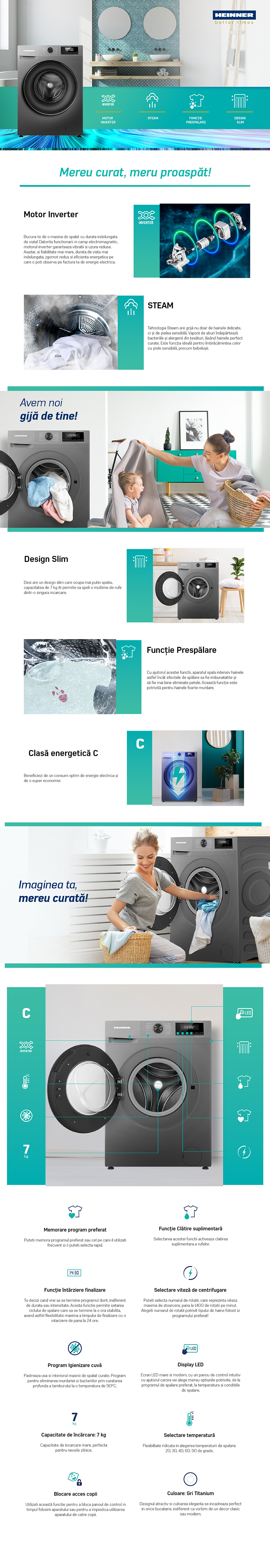 AUTOMATIC WASHING MACHINE HEINNER HWM-H7014IVSMTC+++, LOADING CAPACITY 7KG, SPIN SPEED 1400RPM, ENERGY EFFICIENCY CLASS A, INVERTER MOTOR, 15 PROGRAMS, DIGITAL DISPLAY, QUICK PROGRAM 15 MIN, ALLERGY STEAM PROGRAM, BABY STEAM CARE PROGRAM, DELAY END, EXTRA-RINSE, PRE-WASH, INTENSIVE WASH, AUTOMATIC WEIGHTING, FAVOURITE PROGRAM, TEMPERATURE SELECTOR, SPIN SPEED SELECTOR CHILD LOCK, DIMENSIONS (WXDXH): 59.5X46.5X84.5 CM, COLOR: TITANIUM GRAY