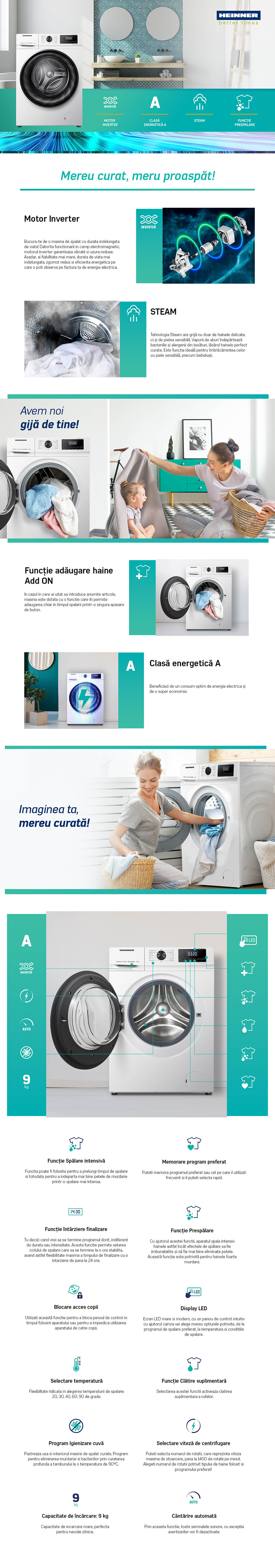AUTOMATIC WASHING MACHINE HEINNER HWM-H9014INVA+++, CAPACITY 9KG, SPIN SPEED 1400RPM, ENERGY EFFICIENCY CLASS A, MOTOR INVERTER, 15 PROGRAMS, DIGITAL DISPLAY, QUICK PROGRAM 15 MIN, ALLERGY STEAM PROGRAM , BABY STEAM CARE PROGRAM, DELAY END FUNCTION, EXTRA RINSE, PRE-WASH, ADD-ON FUNCTION, AUTOMATIC WEIGHTING, FAVOURITE PROGRAM, TEMPERATURE SELECTOR, SPIN SPEED SELECTION, CHILD LOCK, DIMENSIONS ( WXDXH): 60X61X85 CM, COLOUR: WHITE