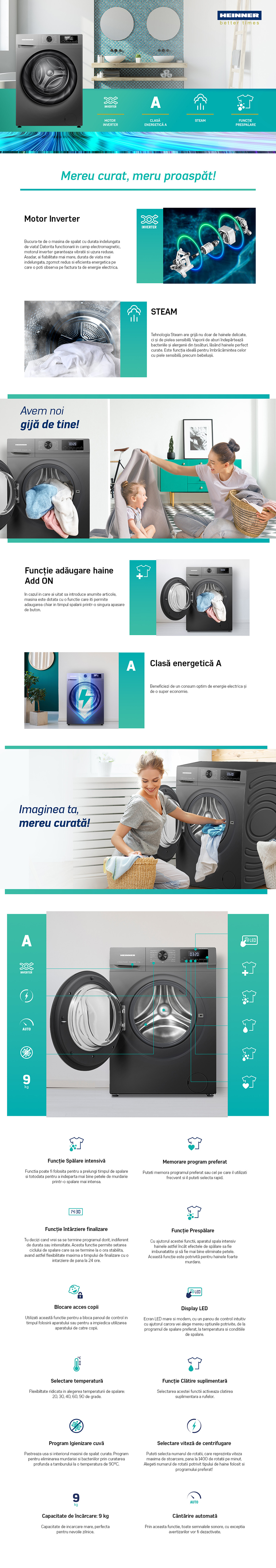 AUTOMATIC WASHING MACHINE HEINNER HWM-H9014INVTA+++, LOADING CAPACITY 9KG, SPIN SPEED 1400RPM, ENERGY EFFICIENCY CLASS A, INVERTER MOTOR, 15 PROGRAMS, DIGITAL DISPLAY, QUICK PROGRAM 15 MIN, ALLERGY STEAM PROGRAM, BABY STEAM CARE PROGRAM, DELAY END, EXTRA-RINSE, PRE-WASH, RELOAD FUNCTION, AUTOMATIC WEIGHTING, FAVOURITE PROGRAM, TEMPERATURE SELECTOR, SPIN SPEED SELECTOR CHILD LOCK, DIMENSIONS (WXDXH): 60X61X85 CM, COLOR: TITANIUM GRAY