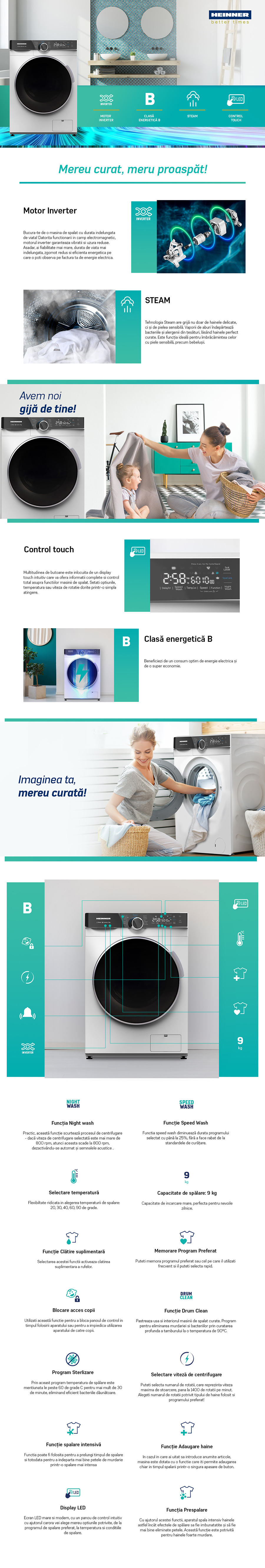 AUTOMATIC WASHING MACHINE HEINNER HWM-M914IVKB+++, LOADING CAPACITY 9KG, SPIN SPEED 1400RPM, ENERGY EFFICIENCY CLASS B, INVERTER MOTOR, 14 PROGRAMS,TOUCH CONTROL, DIGITAL DISPLAY, QUICK PROGRAM 15 MIN, SPACARE STEAM PROGRAM, BABY CARE PROGRAM, STERILIZATION PROGRAM, EXTRA-RINSE, DELAY END, SPEED WASH FUNCTION, RELOAD FUNCTION, FAVOURITE PROGRAM MEMORY FUNCTION, TEMPERATURE SELECTOR, SPIN SPEED SELECTOR, DIMENSIONS (WXDXH): 59.5X56.5X85 CM, COLOR: WHITE