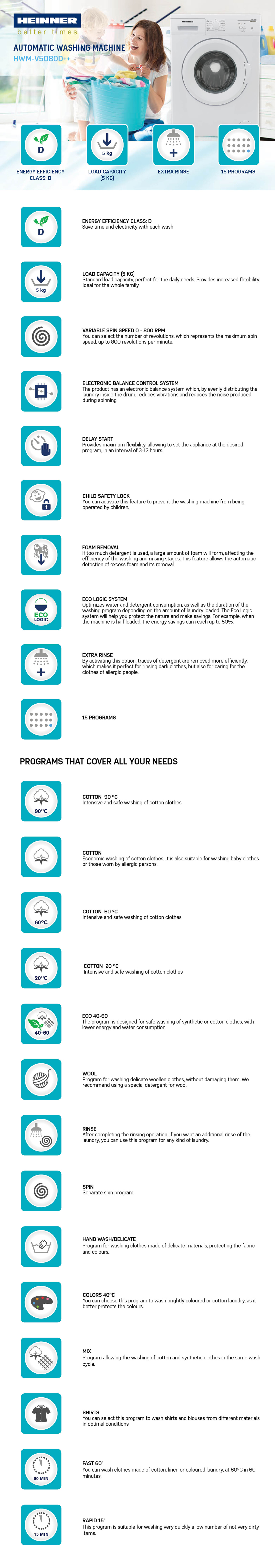 Automatic washing machine Heinner HWM-V5080D++, Loading capacity 5kg, Spin speed 800rpm, Energy efficiency class D, 15 programs, Quick program 15 min, Fast program 60 min, Delay start, Extra rinse function, Eco logic system, Foam detection system, Balance control system, Child lock, Dimensions (WxDxH): 59.7x49.7x84.5 cm, Color: White