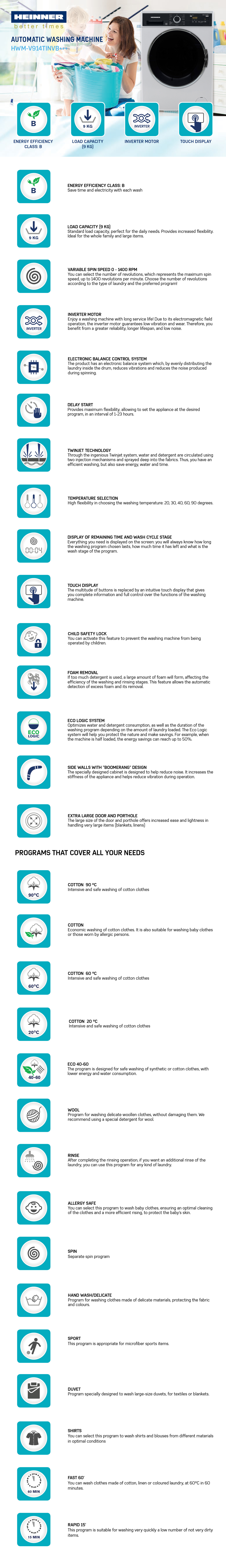 Automatic washing machine Heinner HWM-V914TINVB++, Loading capacity 9kg, Spin speed 1400rpm, Energy efficiency class B, Inverter motor, 15 programs, Elegant design with black panel and chromed door, LED display, Touch control, Quick program 12 min, Fast program 60 min, Allergy safe, Delay start, Easy ironing, Eco logic system, Foam detection system, Balance control system, Child lock, Dimensions (WxDxH): 59.7x58.2x84.5 cm, Color: White
