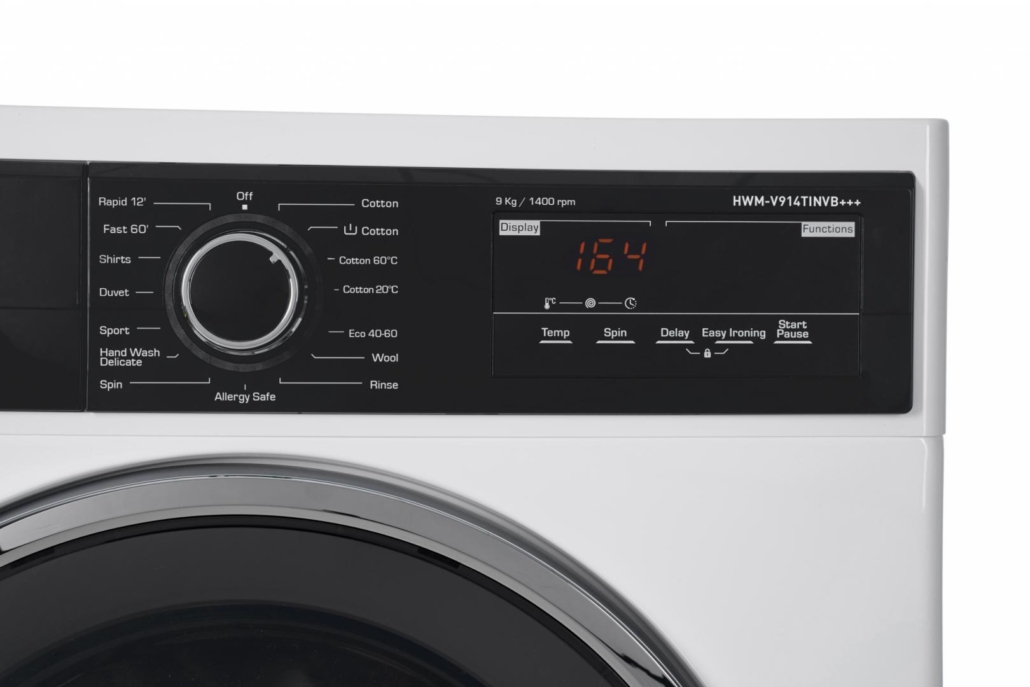 Automatic washing machine Heinner HWM-V914TINVB++, Loading capacity 9kg, Spin speed 1400rpm, Energy efficiency class B, Inverter motor, 15 programs, Elegant design with black panel and chromed door, LED display, Touch control, Quick program 12 min, Fast program 60 min, Allergy safe, Delay start, Easy ironing, Eco logic system, Foam detection system, Balance control system, Child lock, Dimensions (WxDxH): 59.7x58.2x84.5 cm, Color: White