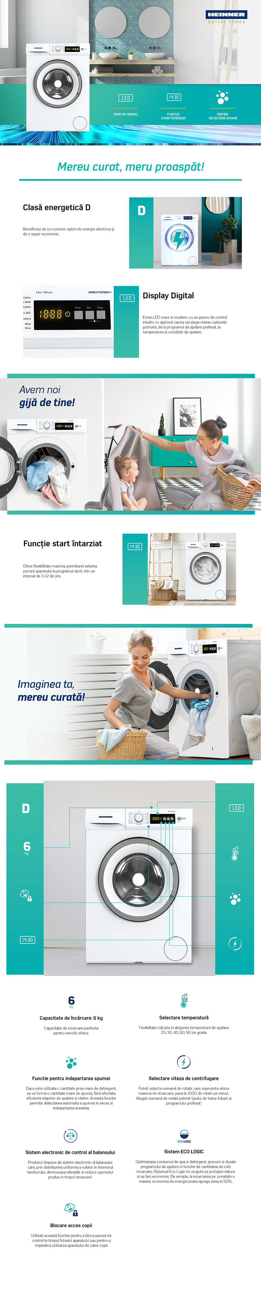 Automatic washing machine Heinner HWM-VT1610KD++, Loading capacity 6kg, Spin speed 1000rpm, Energy efficiency class D, 15 programs, Digital display, Quick program 15 min, Short 60 min, Allergy safe program, Delay end, Eco logic system, Foam detection system, Balance control system, Child lock, Dimensions (WxDxH): 59.7X49.7X84.5 cm, Color: White