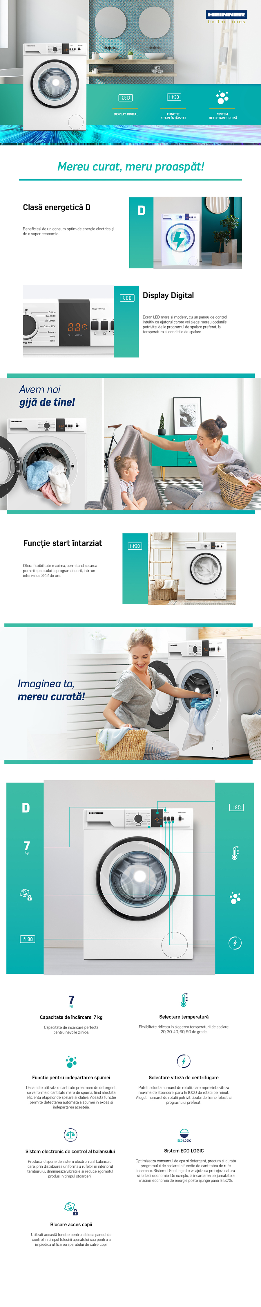 Automatic washing machine Heinner HWM-VT1710CHD++, Loading capacity 7kg, Spin speed 1000rpm, Energy efficiency class D, 15 programs, Digital display, Quick program 15 min, Short 60 min, Allergy safe program, Delay end, Eco logic system, Foam detection system, Balance control system, Child lock, Dimensions (WxDxH): 59.7X52.7X84.5 cm, Color: White