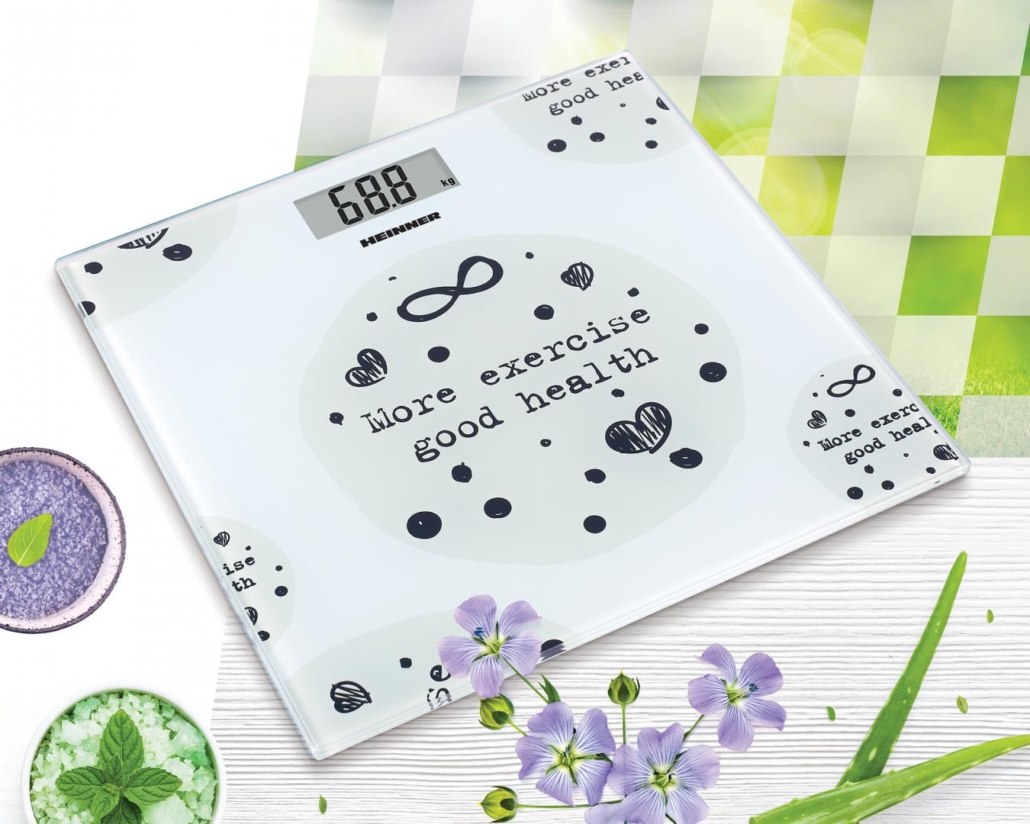 Bathroom scale Heinner Ideal 150 HBS-150MSJ, 150kg, 6 mm tempered glass platform, LCD display, division: 100g, auto on/off, low battery indicator, overload indicator, design with motivational message, included battery: 1 x CR2032 Li