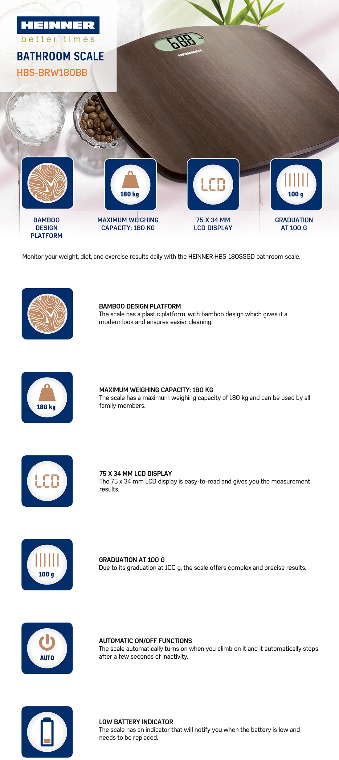 Bathroom scale Heinner DarkBamboo 180 HBS-BRW180BB, 180kg, bamboo design platform, LCD display, division: 100g, auto on/off, low battery indicator, battery: 2 x 1.5V AAA