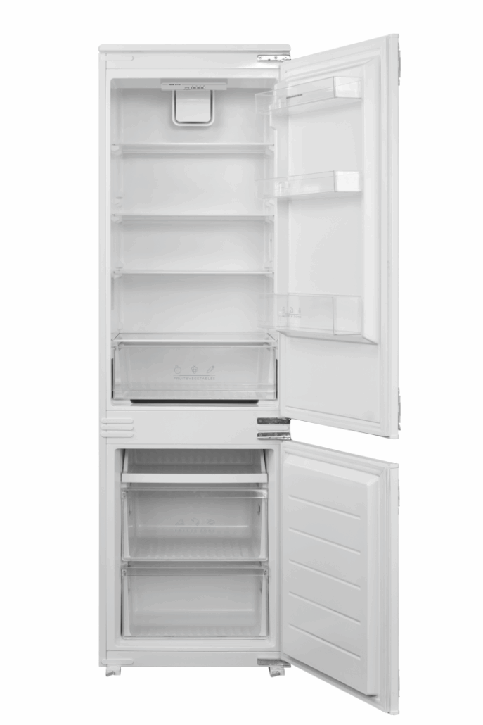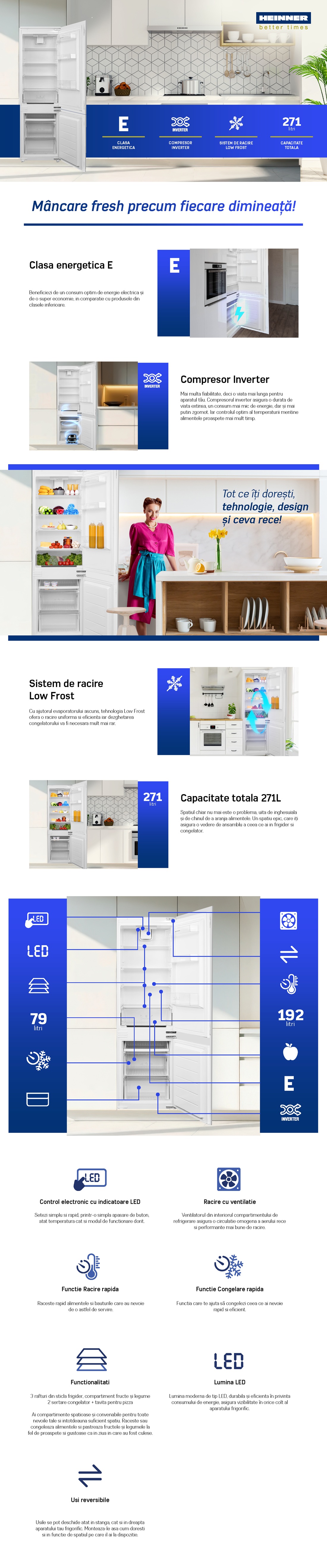 Built in combi fridge Heinner HC-BIM271INVE++, Low Frost cooling system, energy efficiency class E, Inverter compressor, total capacity: 271 L, fridge capacity: 192 L, freezer capacity: 79 L, control panel with LED indicators, electronic control, refrigerator fan, Super cooling function, Super freezing function, LED light, crisper drawer, 3 fridge glass shelves, 2 freezer drawers + pizza tray, reversible doors, freezing capacity: 3.6kg/24h, dimensions (WxDxH): 54 x 55 x 178.5 cm