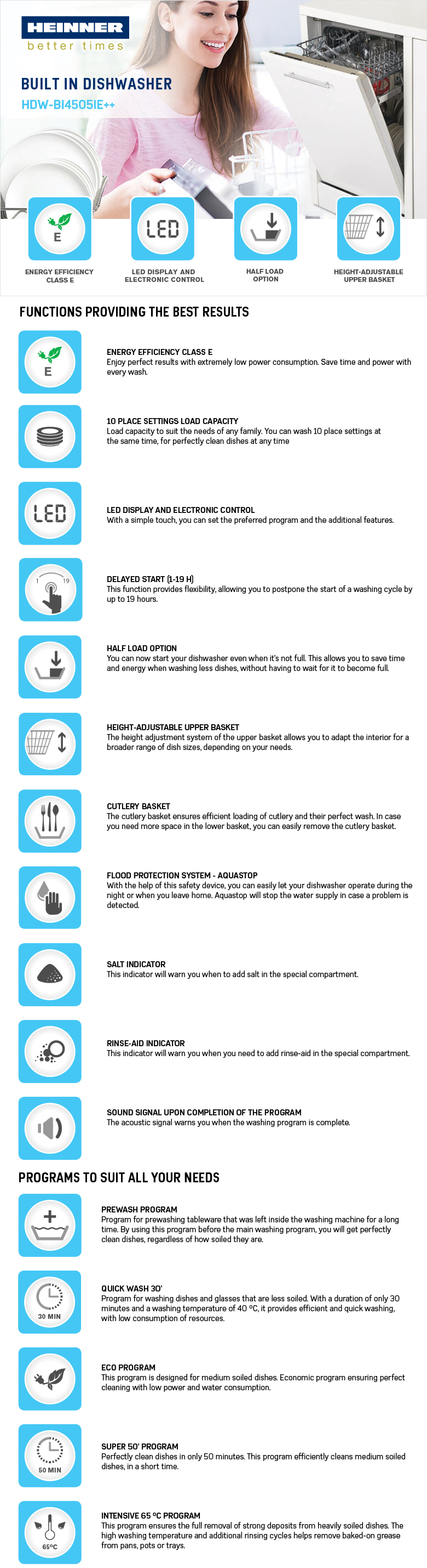 Built in dishwasher Heinner HDW-BI4505IE++, 10 place settings, Energy efficiency class E, Electronic control, LED Display, 5 washing programs, Fast program 30’, Intensive program, ECO Program, Half load option, Delay timer option (1-19H), Adjustable upper basket (when it’s empty), Protection against water damage – Aquastop, End of program acoustic indicator, Dimensions (IxLxA): 82 x 44.8 x 55 cm