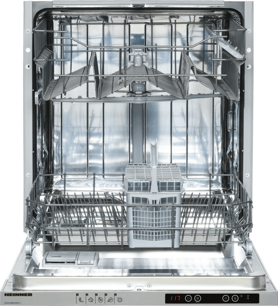 Built in dishwasher Heinner HDW-BI6005IE++, 12 place settings, Energy efficiency class E, Electronic control, LED Display, 5 washing programs, Prewash program, Fast program 30’, Intensive program, Half load option, Delay timer option (1-19H), Adjustable upper basket (when it’s empty), Protection against water damage – Aquastop, End of program acoustic indicator, Dimensions (IxLxA): 82-87 x 59.8 x 55 cm