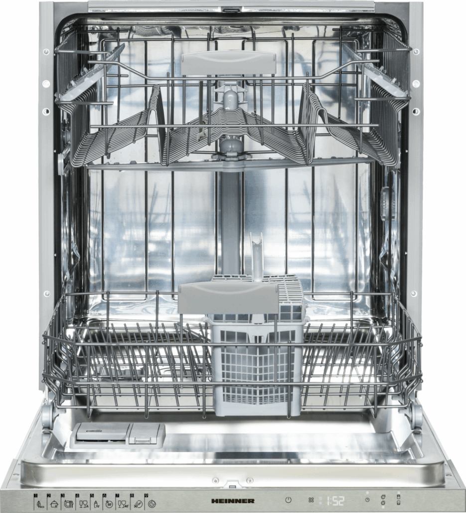 Built in dishwasher Heinner HDW-BI6092TE++, 12 place settings, Energy efficiency class E, Touch control, LED Display, 9 washing programs, Mini Jet program 14’, Fast program 30’, Hygiene program 70°C, Delicate program, Auto program: Delicate/Normal/Intensive, Half load option for both baskets, Delay timer option (1-19H), Extra rinse, Extra drying, Adjustable upper basket (loaded), End of program acoustic indicator, Protection against water damage – Aquastop, Dimensions (IxLxA): 82-87 x 59.8 x 55 cm
