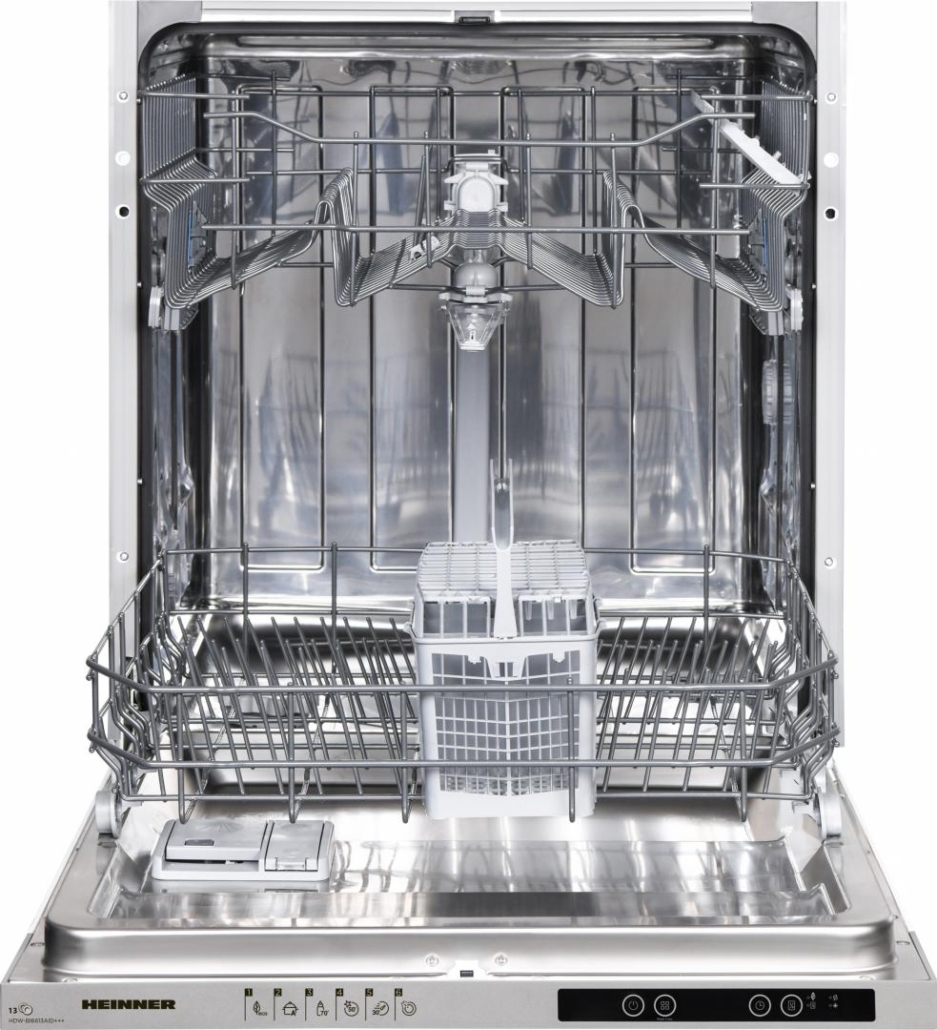 Built in dishwasher Heinner HDW-BI6613AID+++, energy efficiency class D, 13 place settings, electronic control, LED display, 6 washing programs, Quick program 30’, Hygiene 70°C program , Auto Intensive program, delay timer option (1-19H), half load option, adjustable upper basket (loaded), protection against water damage – Aquastop, end of program acoustic indicator, automatic door opening system, water consumption: 12L/washing cycle, dimensions (WxDxH): 59.8 x 55 x 82 cm