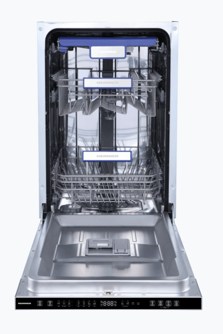 Built in dishwasher Heinner HDW-BIM45710AD+++, 10 place settings, energy efficiency class D, LED display, Auto-door opening, 7 washing programs, Auto Smart program: 55°C - 65°C, Deep Clean - program Hygiene 72°C, Whisper program, Auto-cleaning program, Rapid program 30’, delay timer option (1-24H), half load option on both baskets - Dual zone, Intensive wash function – Power wash, Express wash function, 3 baskets – upper cutlery basket, Flexible space - Adjustable upper basket (loaded), lower basket: 2 foldable plate supports, protection against water damage – Aquastop, water consumption: 8.5L/washing cycle, dimensions (WxDxH): 45 x 55 x 82 cm