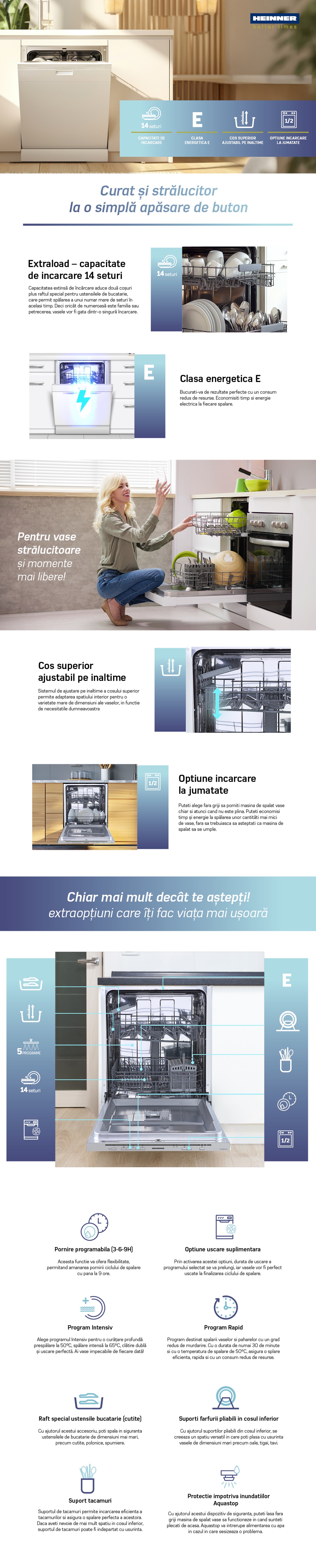 Built in dishwasher Heinner HDW-BIM60514E++, Extraload - 14 place settings, energy efficiency class E, electronic control, 5 washing programs, Rapid program 30’, 90 min. program, Intensive program 65°C, delay timer option (3/6/9H), half load option, Extra drying option, adjustable upper basket (when it’s empty), foldable plate supports in lower basket, knife shelf, protection against water damage – Aquastop, water consumption: 11L/washing cycle, dimensions (WxDxH): 60 x 55 x 82 cm