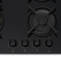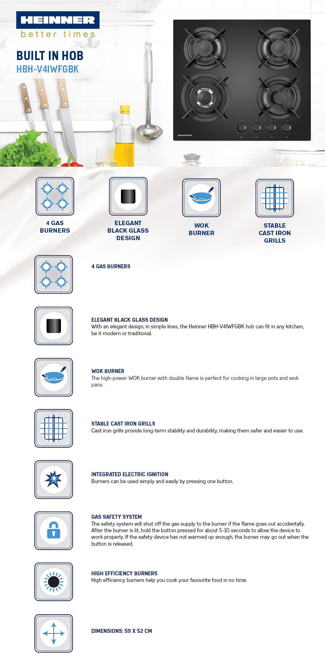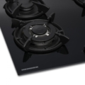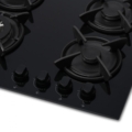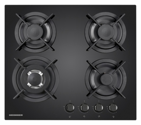 Built in hob Heinner HBH-V4IWFGBK, 4 gas burners, Wok burner, Cast iron pan support, Front control, One touch ignition, Flame failure safety device, Spare LPG nozzles included, Dimensions (WxD): 59x52 cm, Color: Black Glass