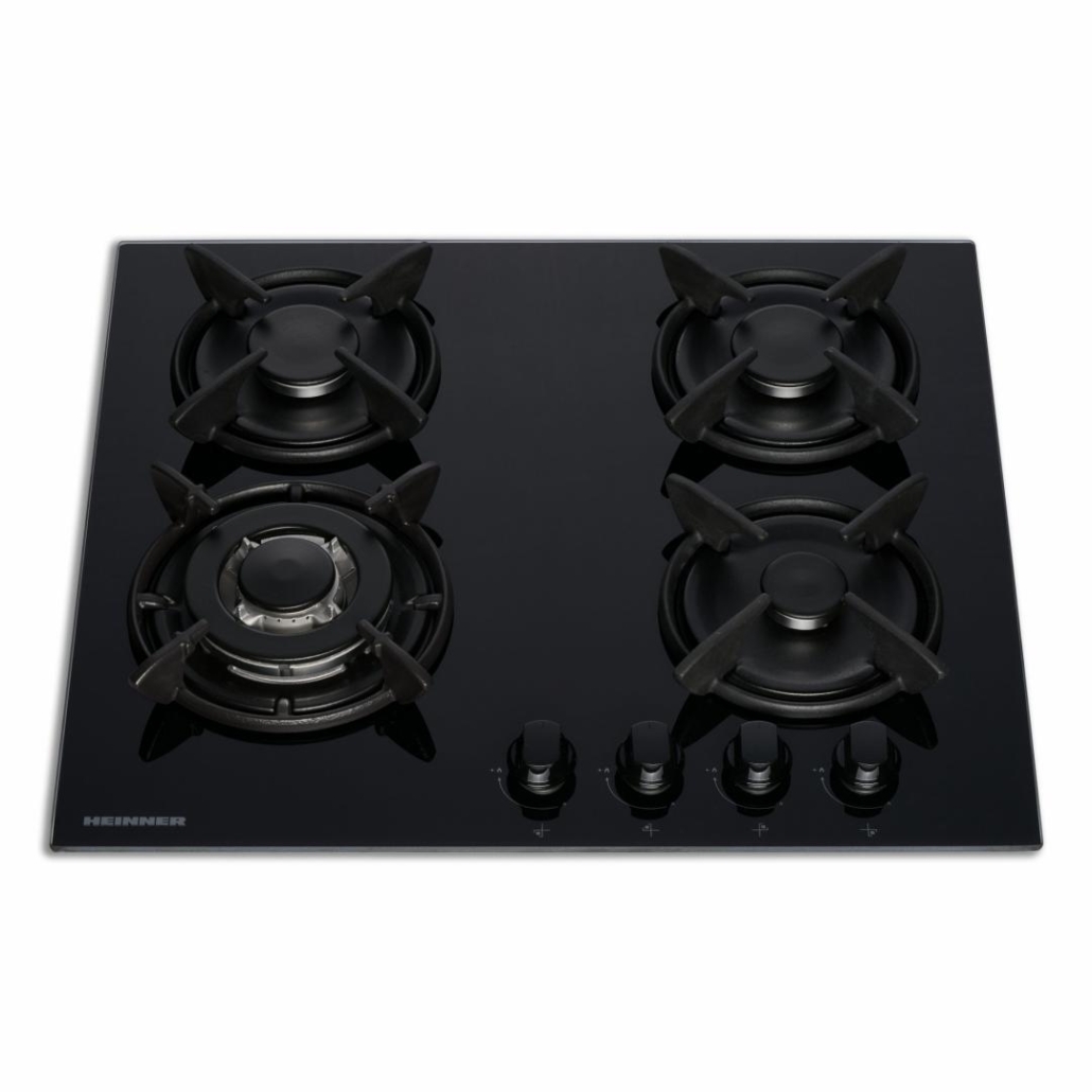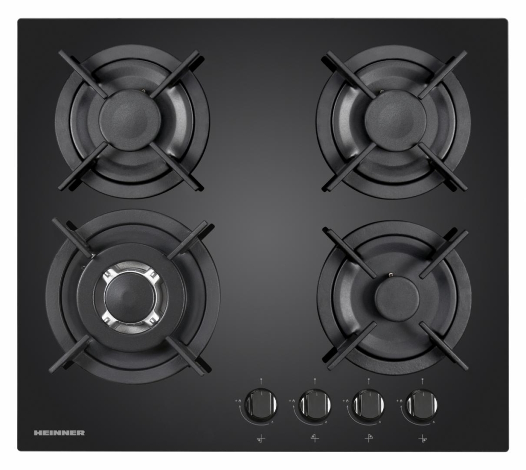 Built in hob Heinner HBH-V4IWFGBK, 4 gas burners, Wok burner, Cast iron pan support, Front control, One touch ignition, Flame failure safety device, Spare LPG nozzles included, Dimensions (WxD): 59x52 cm, Color: Black Glass