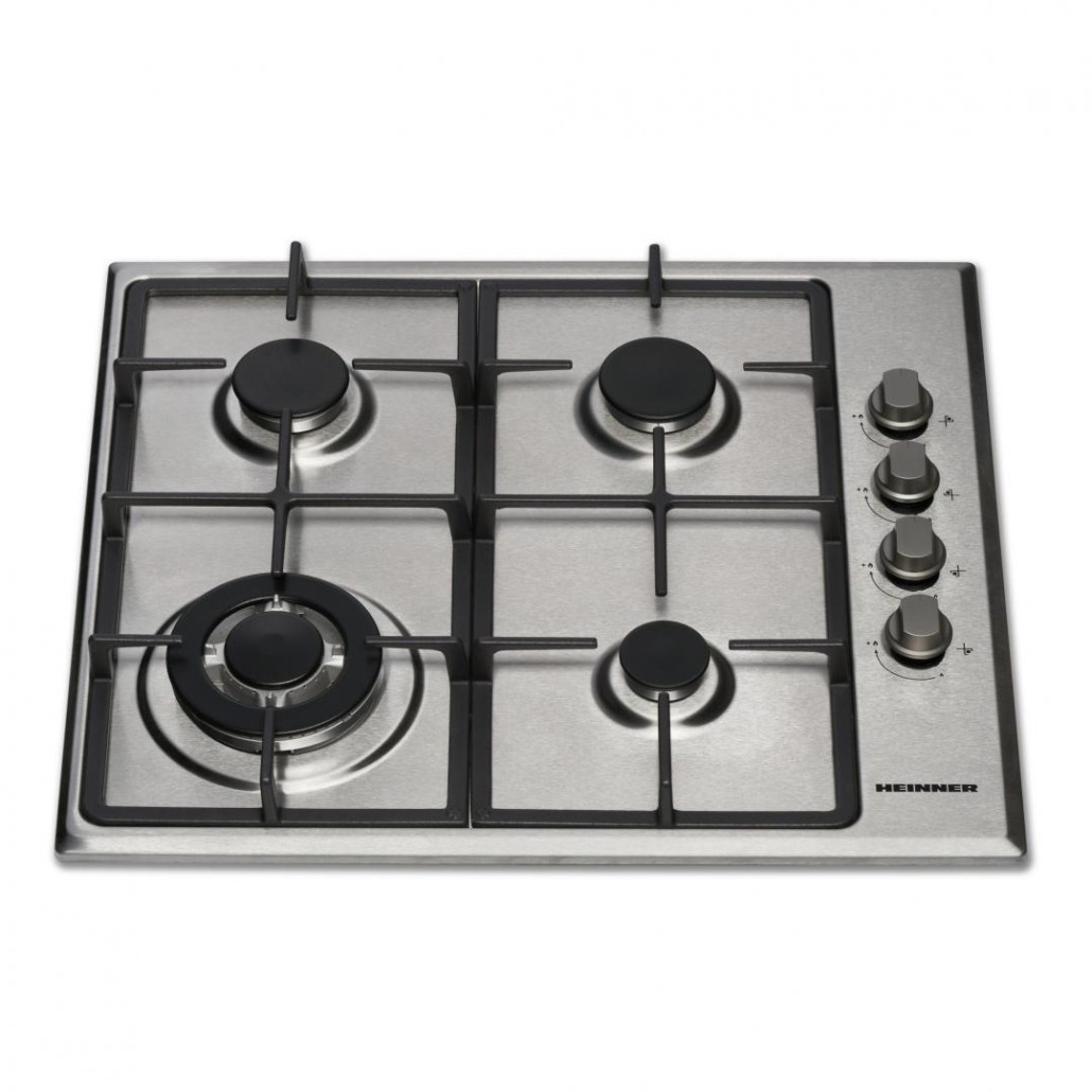 Built in hob Heinner HBH-V4IWFSCIX, 4 gas burners, Wok burner, Cast iron pan support, Right side control, One touch ignition, Flame failure safety device, Spare LPG nozzles included, Dimensions (WxD): 58x51 cm, Color: Stainless steel