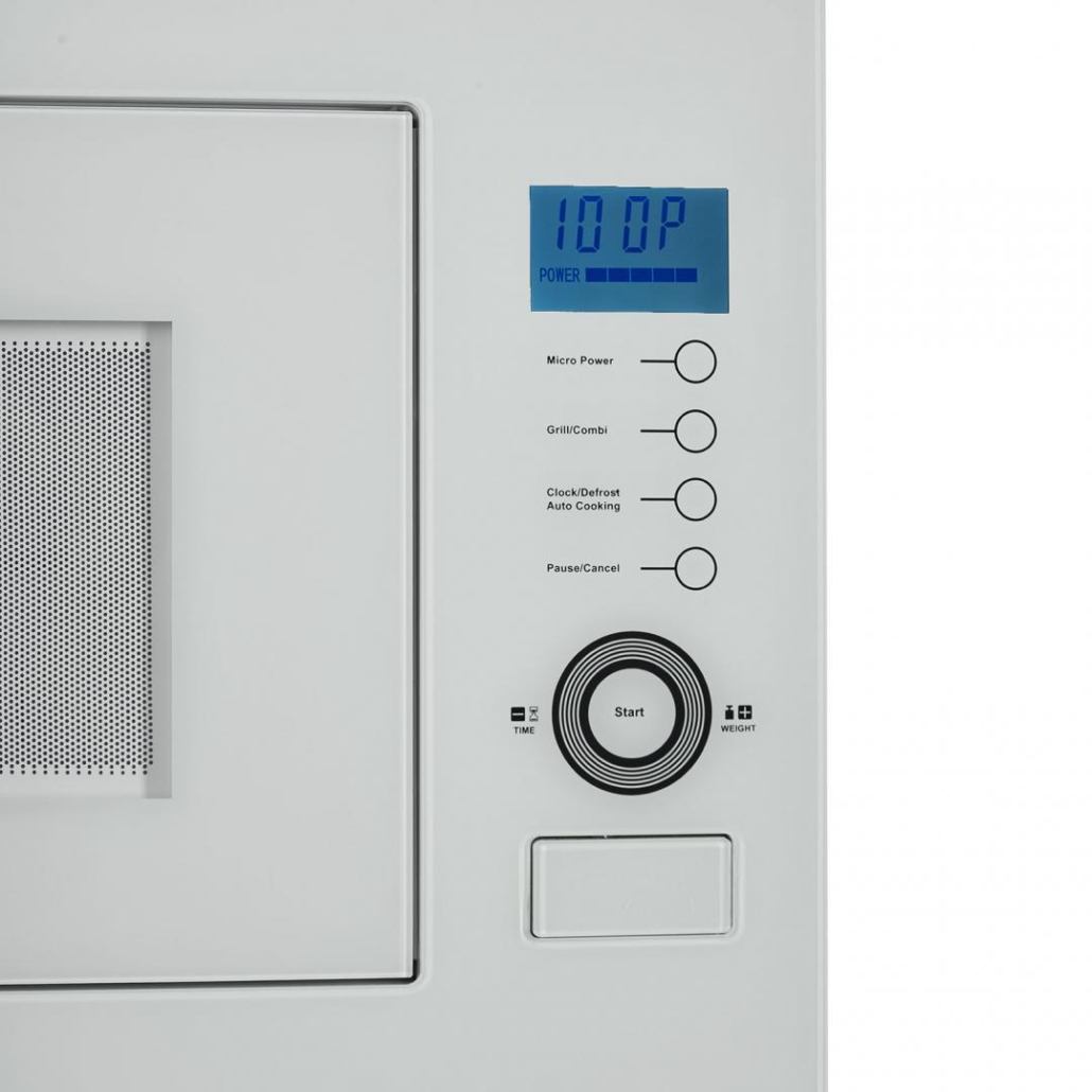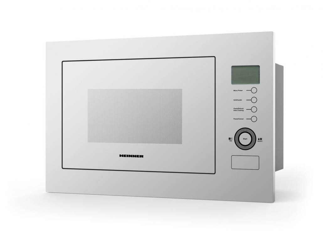 Built in Microwave oven Heinner HMW-25BIGWH, Capacity 25L, Touch control, LCD display, 900W microwave power, 1000W grill power, 5 power levels, 8 auto cooking menus, 60 min cooking time, Defrost function, Cooking end signal, Turntable glass tray 270mm, Dimensions (WxDxH): 59.5x36x39 cm, Color: White glass