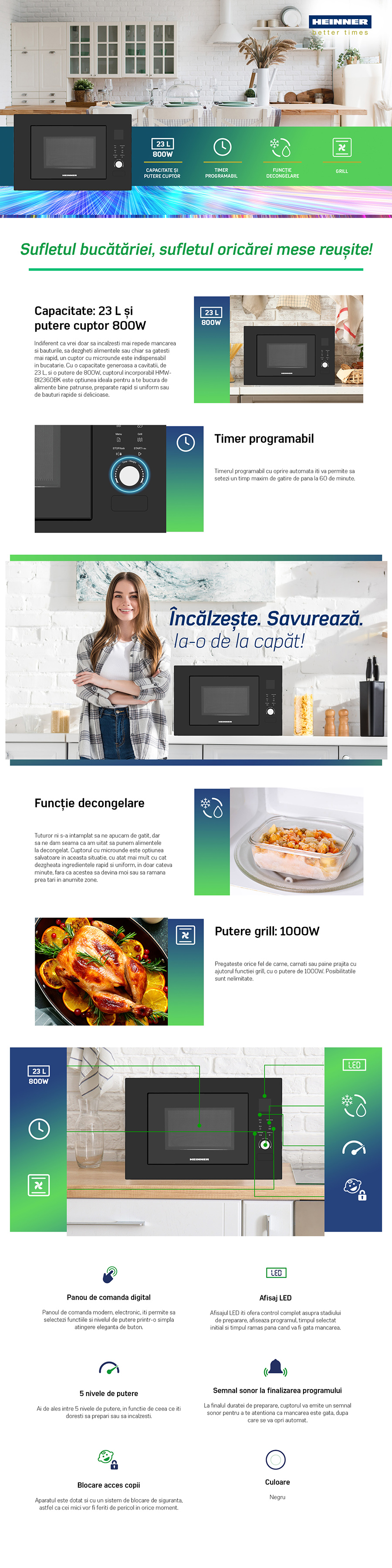 BUILT IN MICROWAVE OVEN HEINNER HMW-BI2360BK, CAPACITY 23L, TOUCH CONTROL, LED DISPLAY, 800W MICROWAVE POWER, 1000W GRILL POWER, 5 POWER LEVELS, TIMER, 60 MIN COOKING TIME, DEFROST FUNCTION, COOKING END SIGNAL, CHILD LOCK FUNCTION, TURNTABLE GLASS TRAY 315MM, DIMENSIONS (WXDXH): 59.5X38.5X33.7 CM, COLOR: BLACK