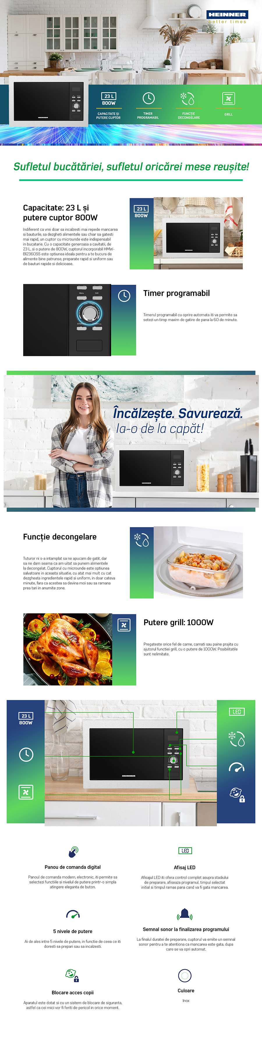 BUILT IN MICROWAVE OVEN HEINNER HMW-BI2360SS, CAPACITY 23L, DIGITAL CONTROL, LED DISPLAY, 800W MICROWAVE POWER, 1000W GRILL POWER, 5 POWER LEVELS, TIMER, 60 MIN COOKING TIME, DEFROST FUNCTION, COOKING END SIGNAL, CHILD LOCK FUNCTION, TURNTABLE GLASS TRAY 315MM, DIMENSIONS (WXDXH): 59.5X38.5X33.7 CM, COLOR: STAINLESS STEEL