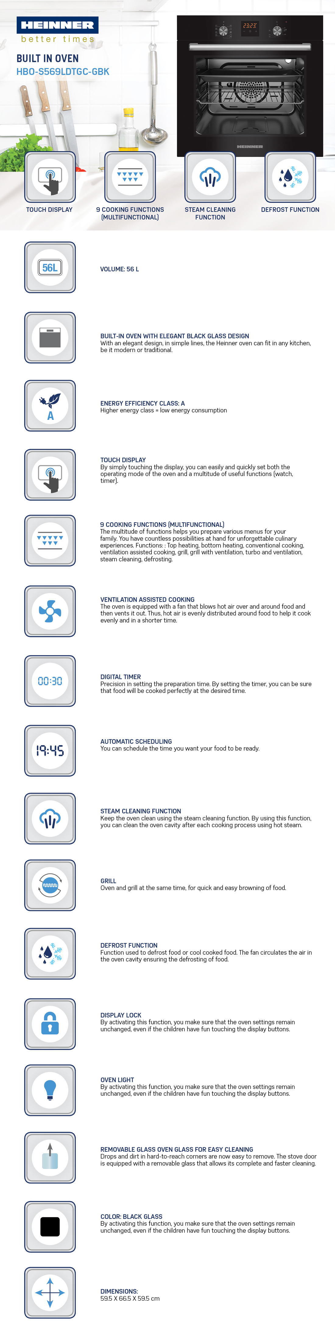 Built in oven Heinner HBO-S569LDTGC-GBK, Multifunctional oven, Capacity 56L, 9 functions, Energy efficiency class A, Digital timer, Display touch, Grill, Fan function, Defrost function, Oven light, Triple glass oven door with inner removable glass, Oven tray and grid, Dimensions (WxDxH): 59.5x56.5x59.5 cm, Color: Black glass