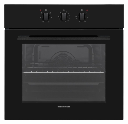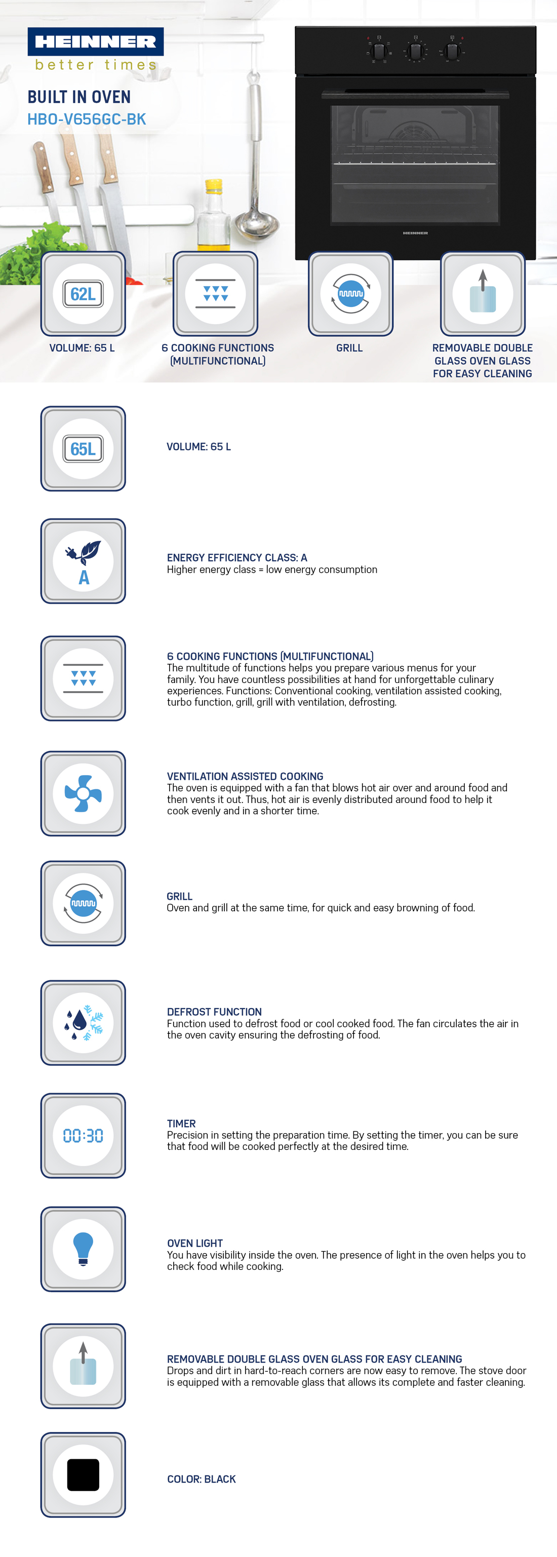 Built in oven Heinner HBO-V656GC-BK, Multifunctional oven, Capacity 65L, 6 functions, Energy efficiency class A, Mechanical timer, Grill, Fan function, Oven light, Double glass oven door with inner removable glass, Oven tray and grid, Dimensions (WxDxH): 59.5x55.0x59.5 cm, Color: Black