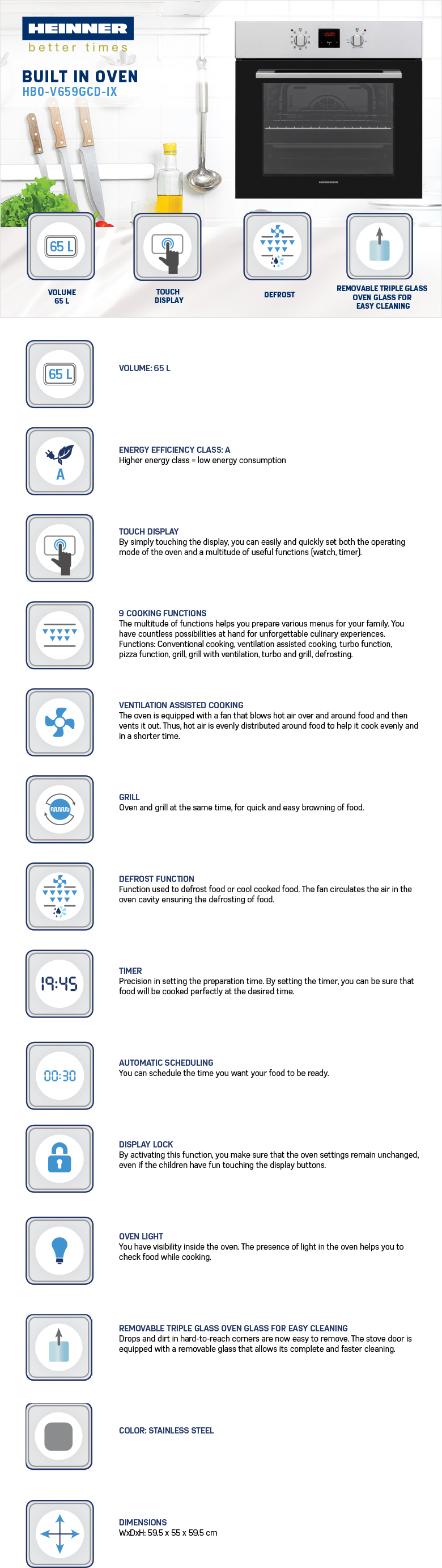Built in oven Heinner HBO-V659GCD-IX, Multifunctional, Capacity 65L, 9 functions, Energy efficiency class A, Digital Timer, Display touch, Grill, Fan function, Turbo function, Pizza function, Defrost function, Oven light, Key lock, Triple glass oven door with inner removable glass, Oven tray and grid, Dimensions: 59.5x55.0x59.5 cm, Color: Stainless steel