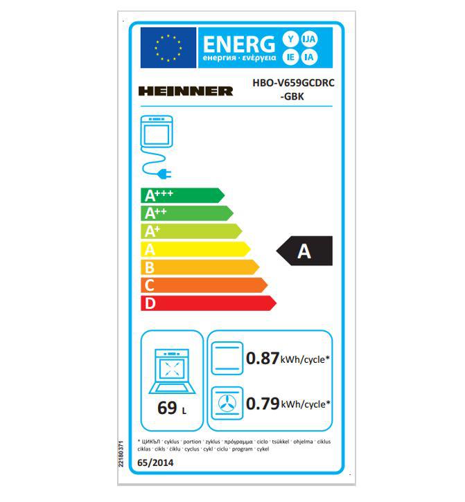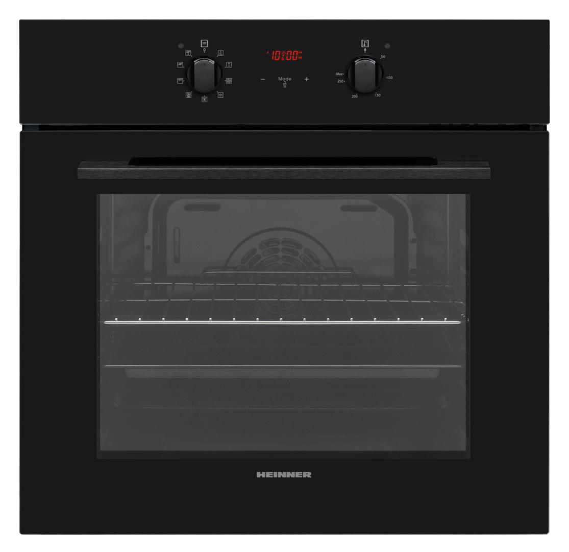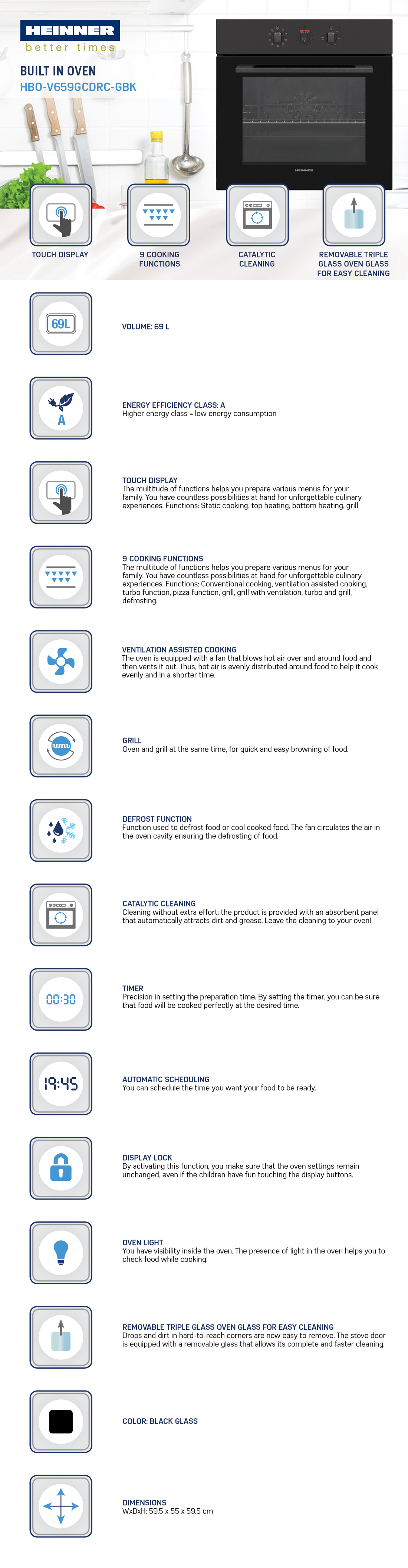 Built in oven Heinner HBO-V659GCDRC-GBK, Multifunctional oven, Capacity 69L, 9 Functions, Energy efficiency class A, Digital Timer, Display touch, Grill, Fan function, Turbo function, Pizza function, Defrost function, Oven light, Key lock, Catalytic self-cleaning (Back wall), Triple glass oven door with inner removable glass, Wire racks, Oven tray and grid, Dimensions: 59.5x55.0x59.5 cm, Color: Black glass