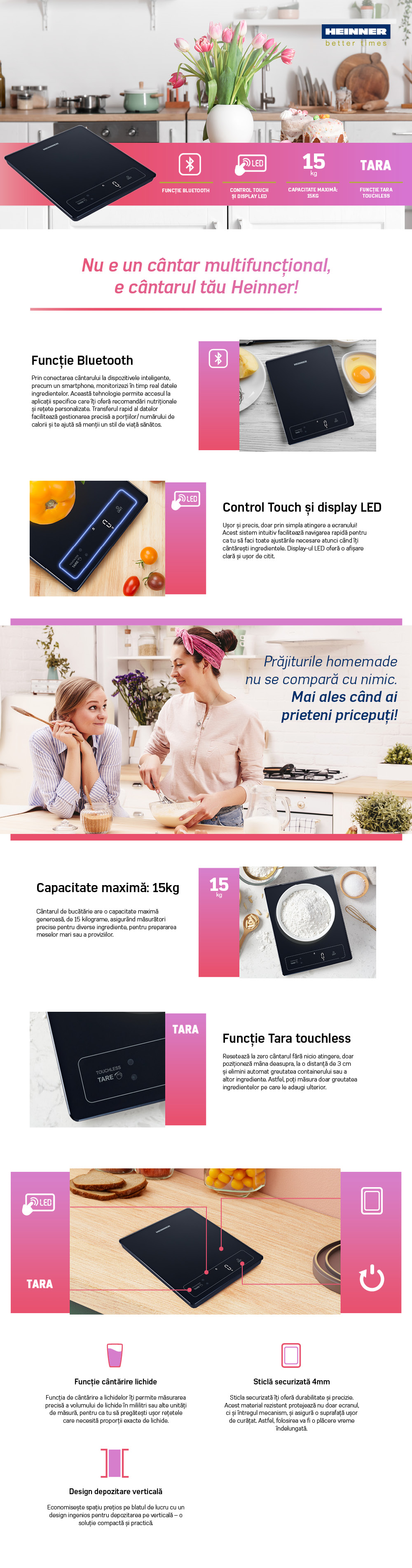 SMART KITCHEN SCALE HEINNER HKS-SM15BK, 15KG, TEMPERED GLASS 4MM, BLUETOOTH FUNCTION, LED DISPLAY, TOUCH CONTROL, TOUCHLESS TARA FUNCTION, DIVISION: 1G, LIQUID WHEIGHTING FUNCTION, VERTICAL STORAGE, BATERIES: 3 X 1.5V AAA (NOT INCLUDED), BLACK