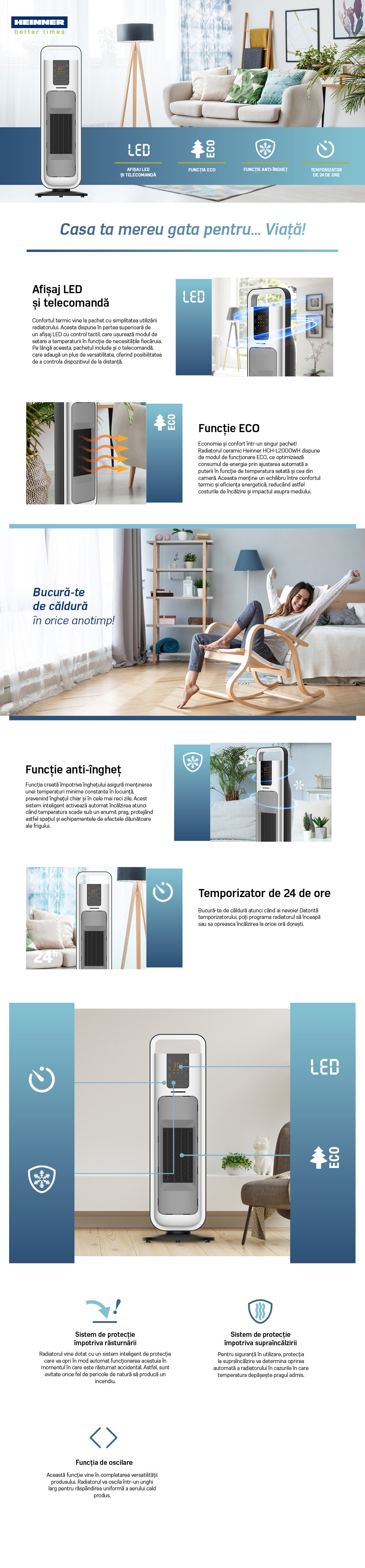 CERAMIC HEATER HEINNER HCH-L2000WH, POWER: 1300/2000W, LED DISPLAY, TOUCH CONTROL, REMOTE CONTROL, ANTI-FREEZING FUNCTION, ECO FUNCTION, AUTO-OFF FUNCTION, TIMER: 24H, OSCILLATION FUNCTION, TIP-OVER SWITCH, OVERHEATING PROTECTION, EASY-CARRY HANDLE, COLOR: BLACK&WHITE