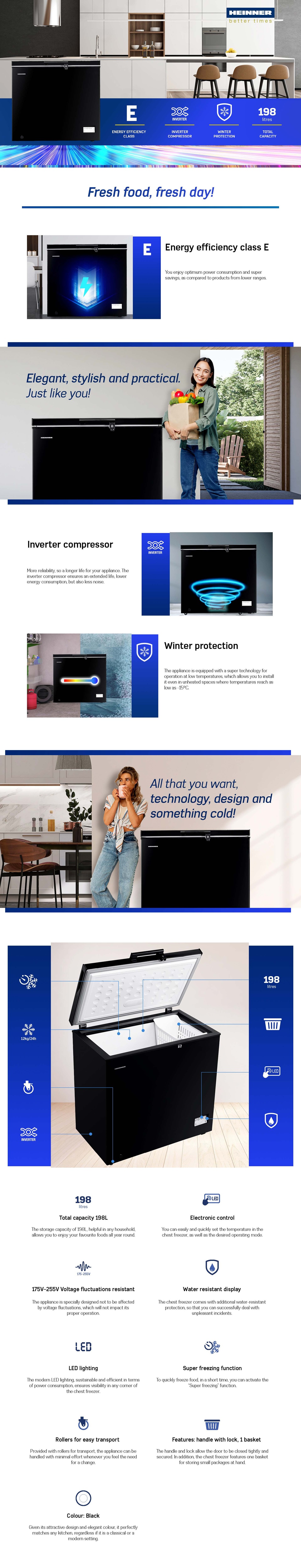 Chest freezer Heinner HCF-205NHBKE++, energy efficiency class: E, total capacity: 198L, electronic control, resistance to low temperatures (operates at low temperatures - up to -15 ° C), resistance to voltage variations 175 ~ 255V, waterproof display, Fast freezing function, 1 plastic basket, manual defrost, wheels for easy transport, freezing capacity: 12kg/24h, dimensions (WxDxH): 90.5 x 54.5 x 84.5 cm, color: black