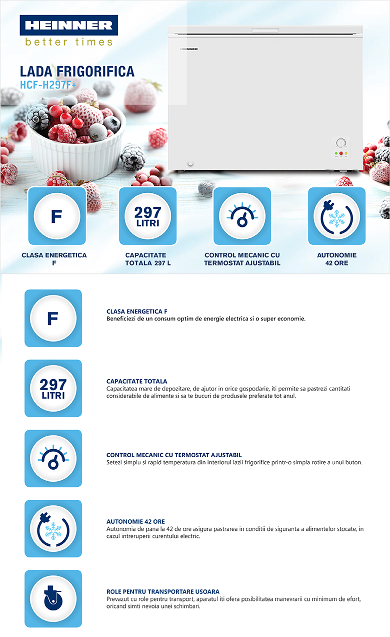 Chest freezer Heinner HCF-H297F+, energy efficiency class: F, total capacity: 297 L, mechanical control with adjustable thermostat, 1 wire basket, wheels for easy transport, freezing capacity: 15 kg/24 h, dimensions (WxDxH): 111.4 x 63 x 84.7, color: White