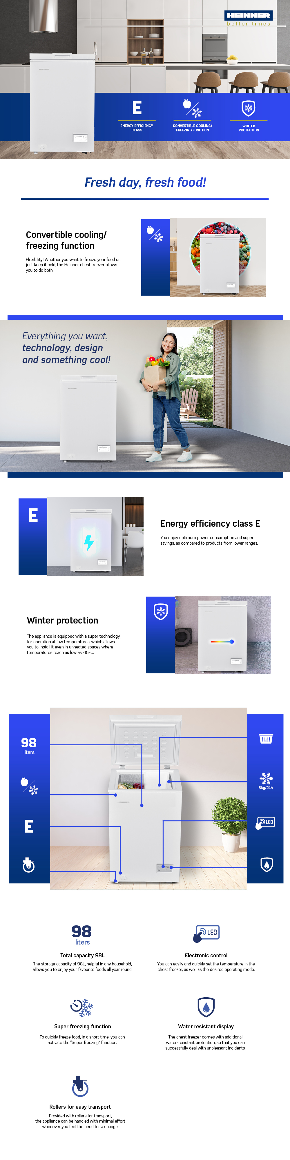 Chest freezer Heinner HCF-HM100CE++, energy efficiency class: E, convertible (Fridge/freezer), total capacity: 98L, electronic control, resistance to low temperatures (operates at low temperatures - up to -15 ° C), waterproof display, Fast freezing function, 1 basket, recessed handle, manual defrost, freezing capacity: 6 kg/24h, dimensions (WxDxH): 54.5 × 54.5 × 84.5 cm, color: White