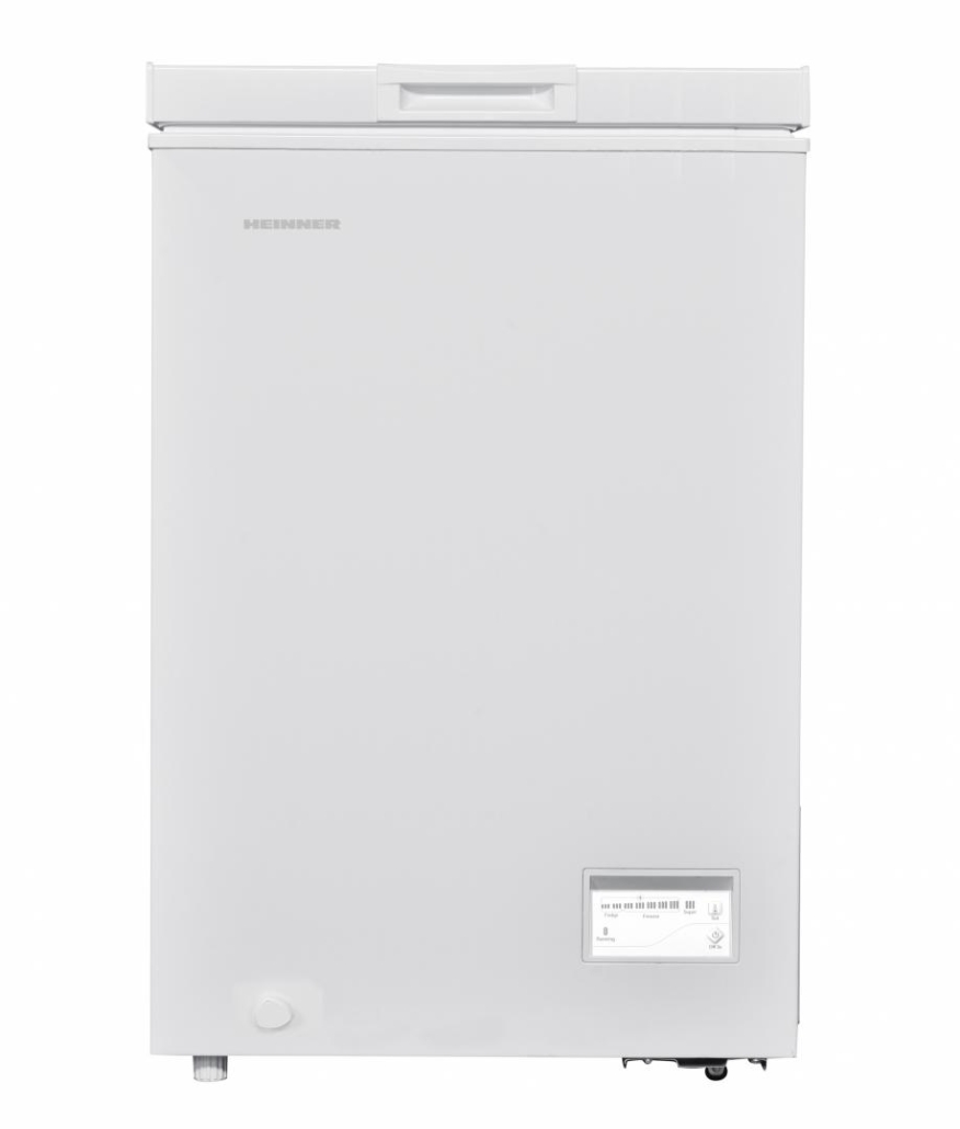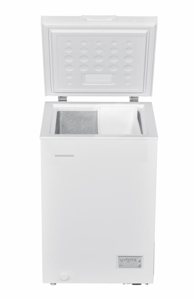 Chest freezer Heinner HCF-HM100CE++, energy efficiency class: E, convertible (Fridge/freezer), total capacity: 98L, electronic control, resistance to low temperatures (operates at low temperatures - up to -15 ° C), waterproof display, Fast freezing function, 1 basket, recessed handle, manual defrost, freezing capacity: 6 kg/24h, dimensions (WxDxH): 54.5 × 54.5 × 84.5 cm, color: White