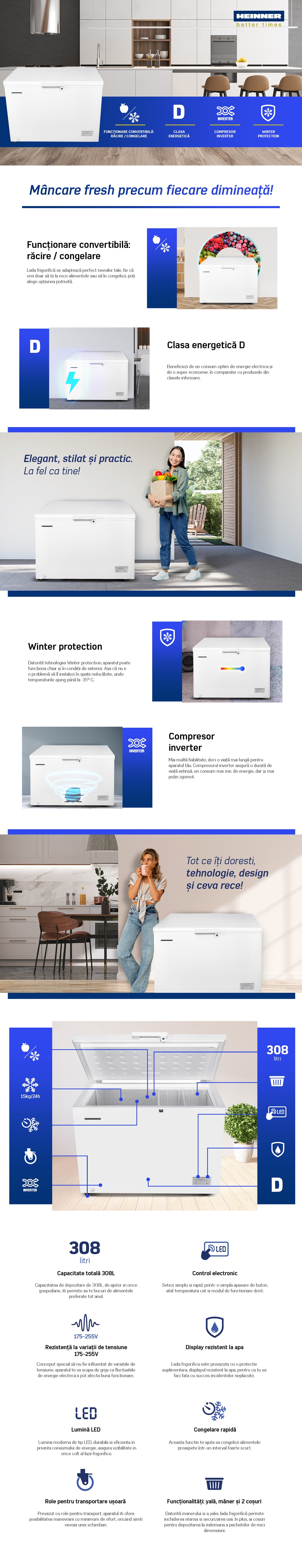 Chest freezer Heinner HCF-HM308INVCD, convertible (Fridge/freezer), energy efficiency class: D, Inverter compressor, total capacity: 308L, electronic control, resistance to low temperatures (operates at low temperatures - up to -15 ° C), resistance to voltage variations 175 ~ 255V, waterproof display, LED light, Fast freezing function, 2 baskets, manual defrost, wheels for easy transport, freezing capacity: 15kg/24h, dimensions (WxDxH): 112 x 75 x 85 cm