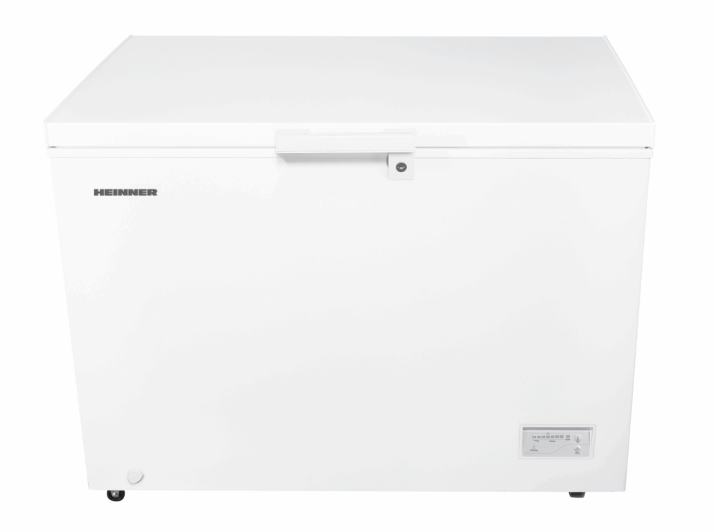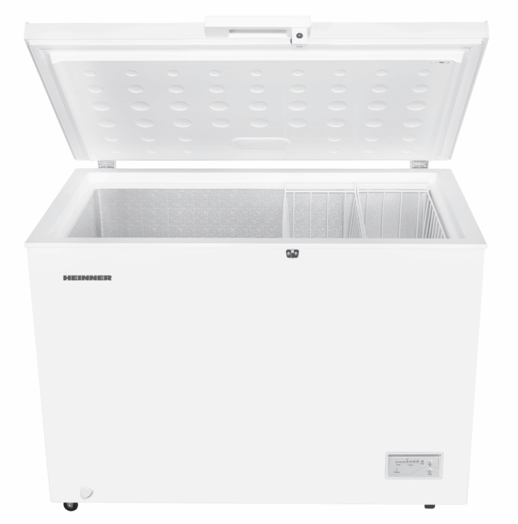 Chest freezer Heinner HCF-HM308INVCD, convertible (Fridge/freezer), energy efficiency class: D, Inverter compressor, total capacity: 308L, electronic control, resistance to low temperatures (operates at low temperatures - up to -15 ° C), resistance to voltage variations 175 ~ 255V, waterproof display, LED light, Fast freezing function, 2 baskets, manual defrost, wheels for easy transport, freezing capacity: 15kg/24h, dimensions (WxDxH): 112 x 75 x 85 cm