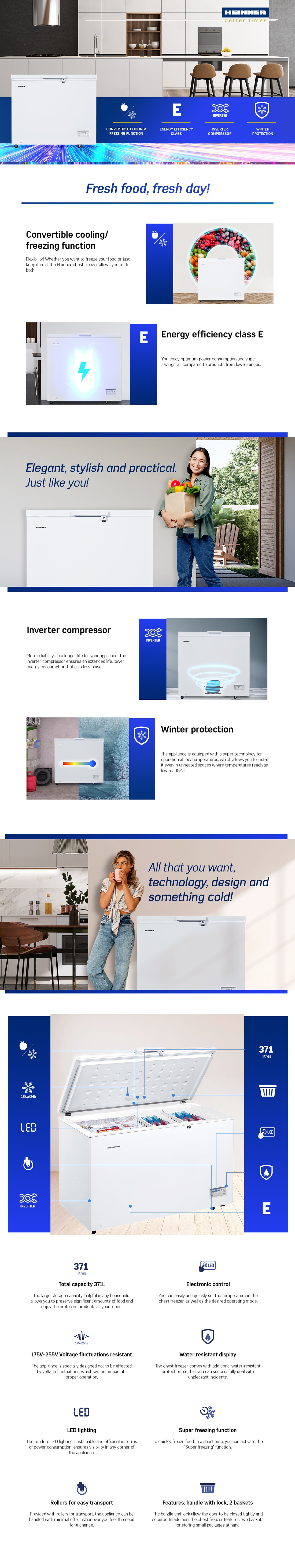Chest freezer Heinner HCF-HM371CE++, energy efficiency class: E, total capacity: 371L, electronic control, resistance to low temperatures (operates at low temperatures - up to -15 ° C), resistance to voltage variations 175 ~ 255V, waterproof display, LED light, Super freezing function, 2 baskets, manual defrost, wheels for easy transport, freezing capacity: 18kg/24h, dimensions (WxDxH): 130 x 70.5 x 85 cm